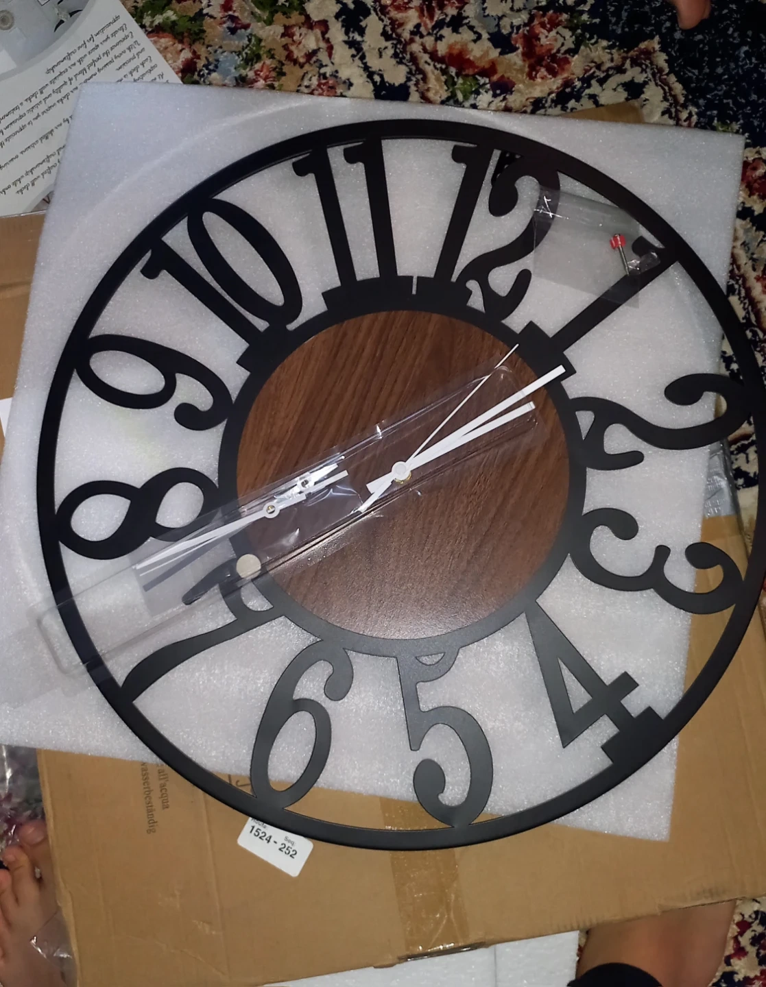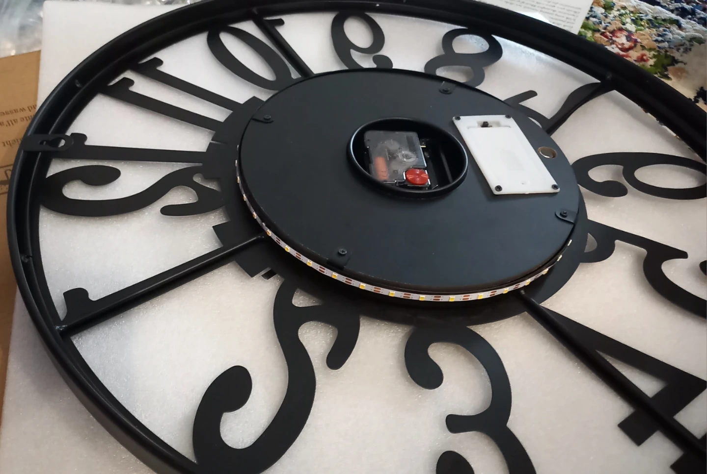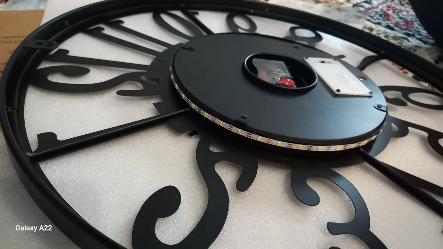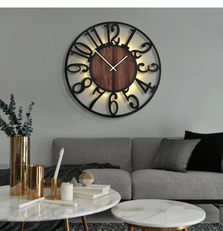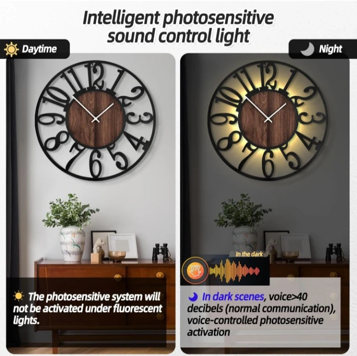 This wall clock features an intelligent photosensitive system that activates backlighting in the dark. It's voice-controlled, so lights turn on with sounds over 40 decibels. The clock has a wood-grain centre and a black metal frame with large numbers. It's great for adding ambiance to a room at night!