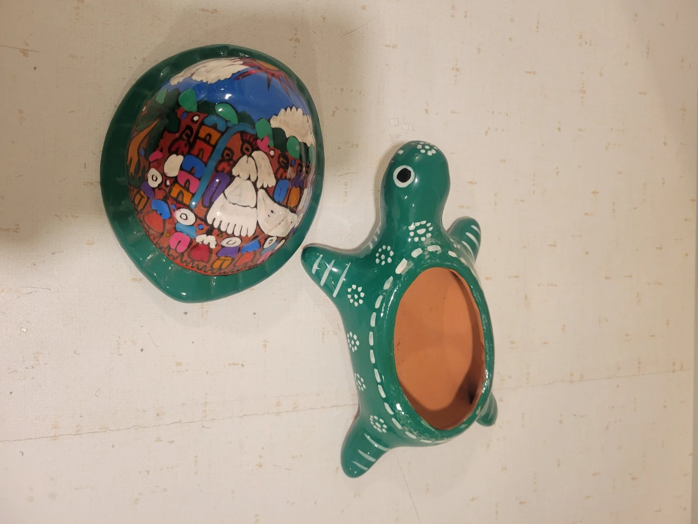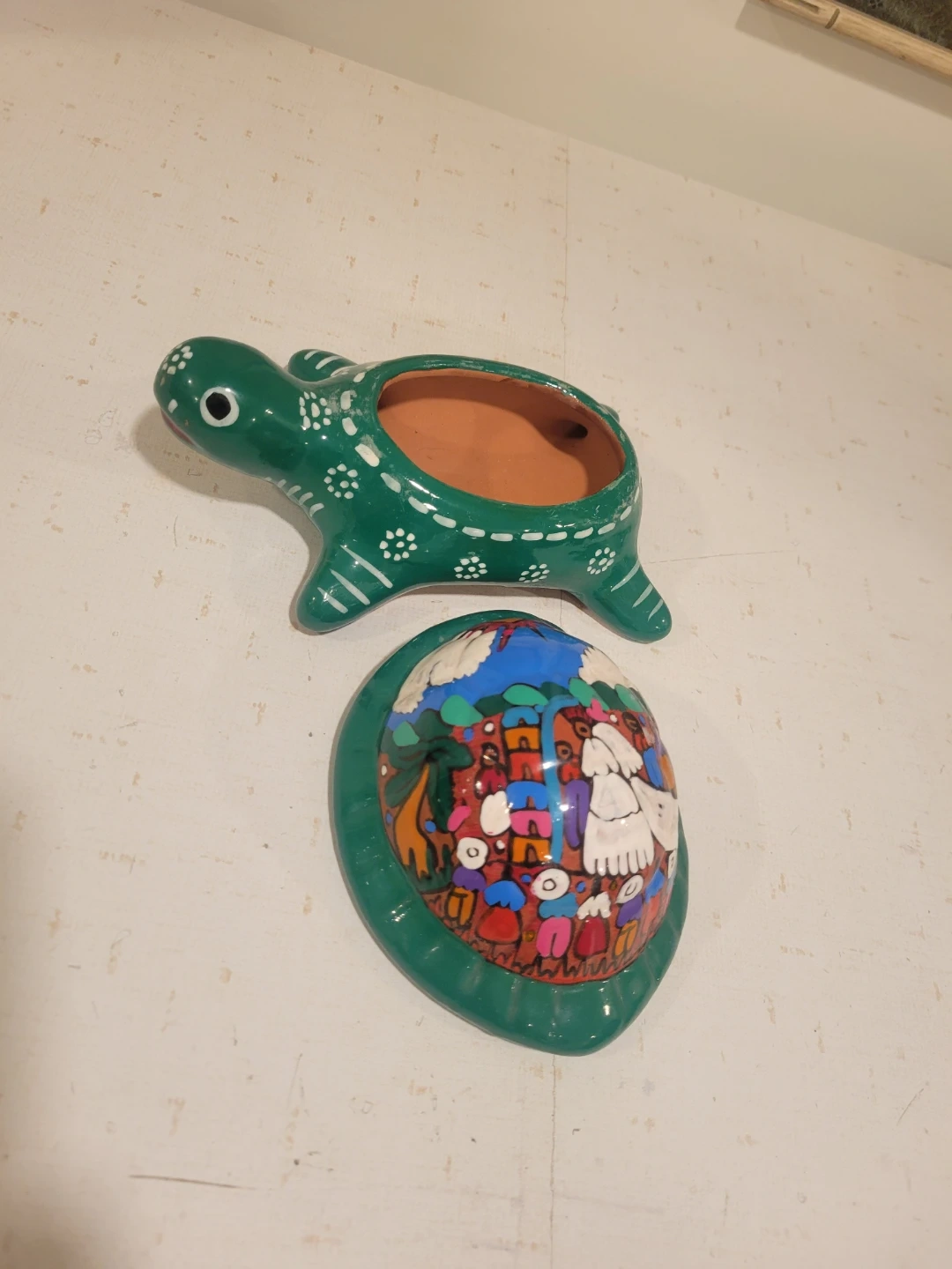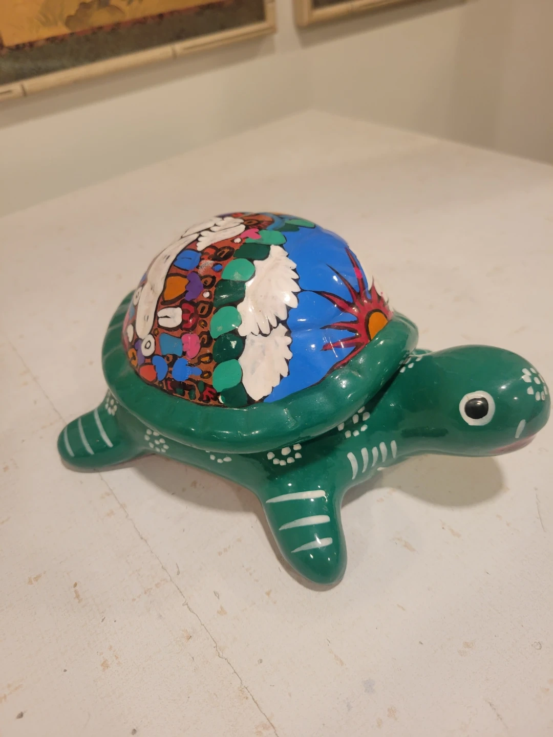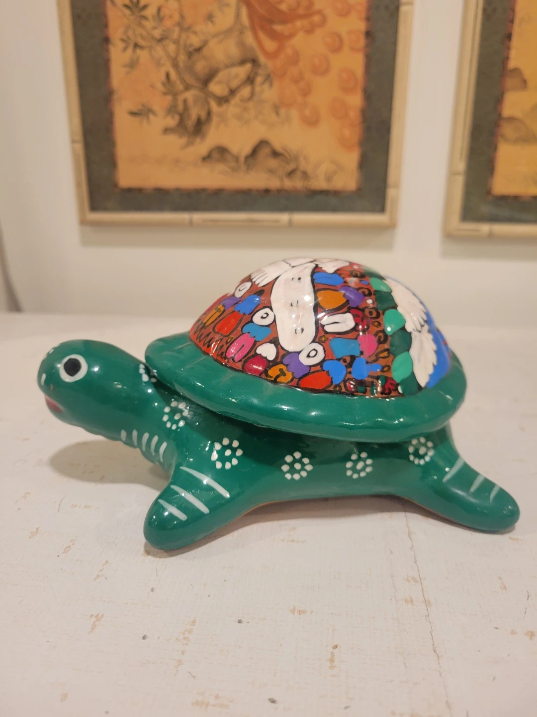 Vibrant Mexican Terracotta Pottery Turtle Trinket Box.