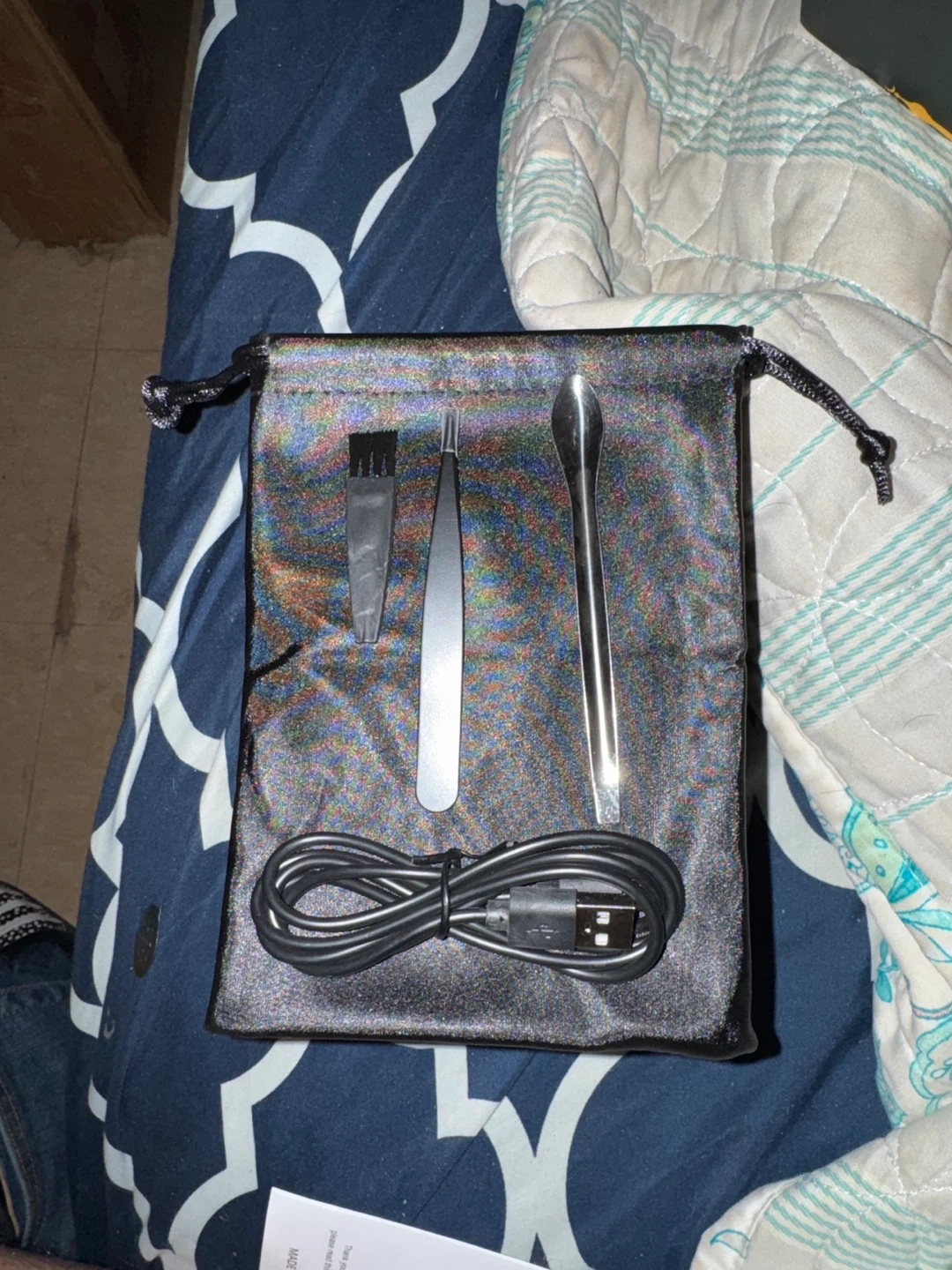 This electric incense burner is designed for Oud Bukhoor. It comes with a USB charging cable and a set of tools including tweezers, a scoop, and a brush, all housed in a storage pouch. It's great for creating a fragrant atmosphere at home or car.