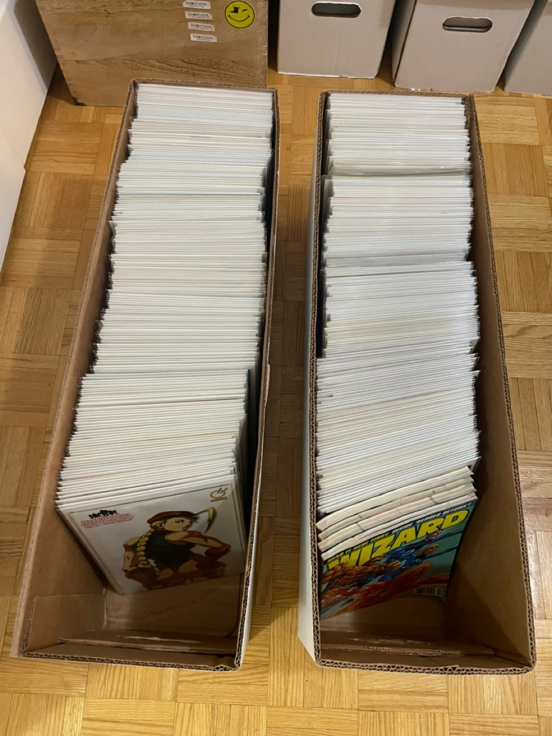 Two large cardboard boxes filled with comic books. Some comics are in protective sleeves. One visible comic is Wizard magazine.