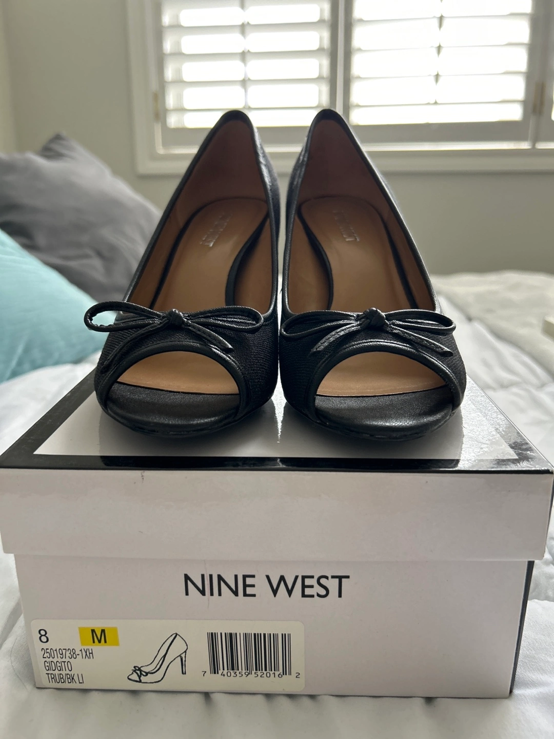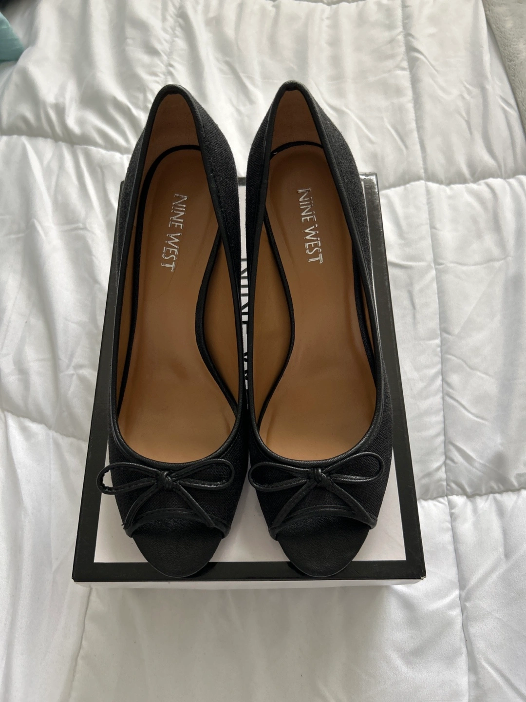 Black peep-toe heels. Size 8 medium. Bow detail. Slight heel. In original box. Brand New Nine West. Porch pick up