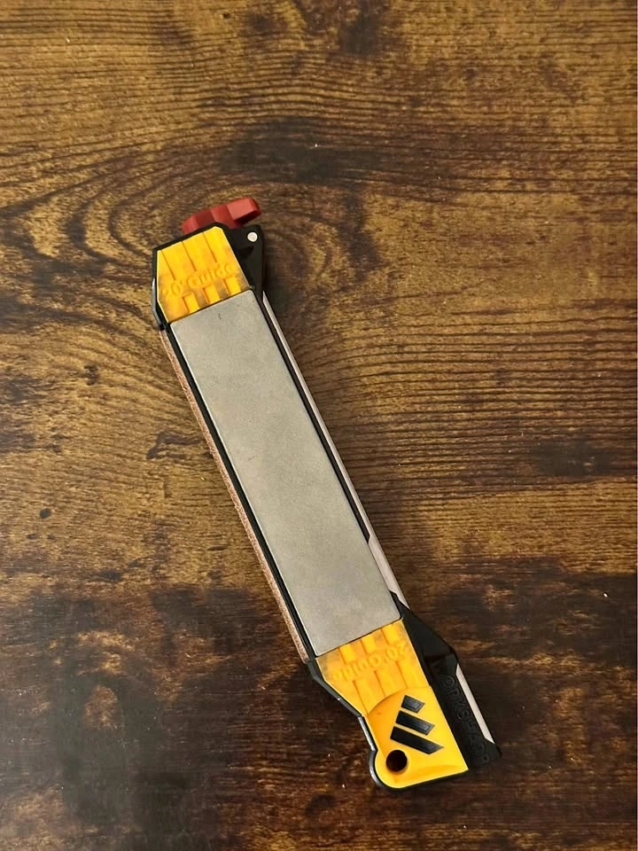 Work Sharp Guided Field Sharpener (model WSGFS221). Compact, portable, and highly versatile sharpener ideal for knives, outdoor tools, and serrated blades. Features: Built-in 20° angle guides for consistent sharpening, diamond sharpening plates (coarse & fine), 3-position ceramic rod (fine, coarse, fish hook), and a leather strop for final edge polishing. Lightweight and easy to carry. Great for camping, hiking, EDC knives, hunting, or general home use.