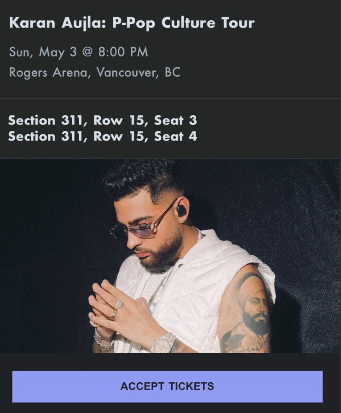I’m selling 4 tickets for the Karan Aujla concert in Vancouver on May 3, 2026.