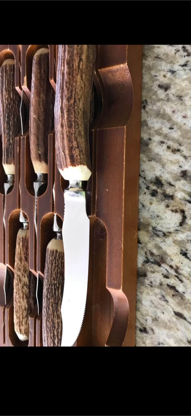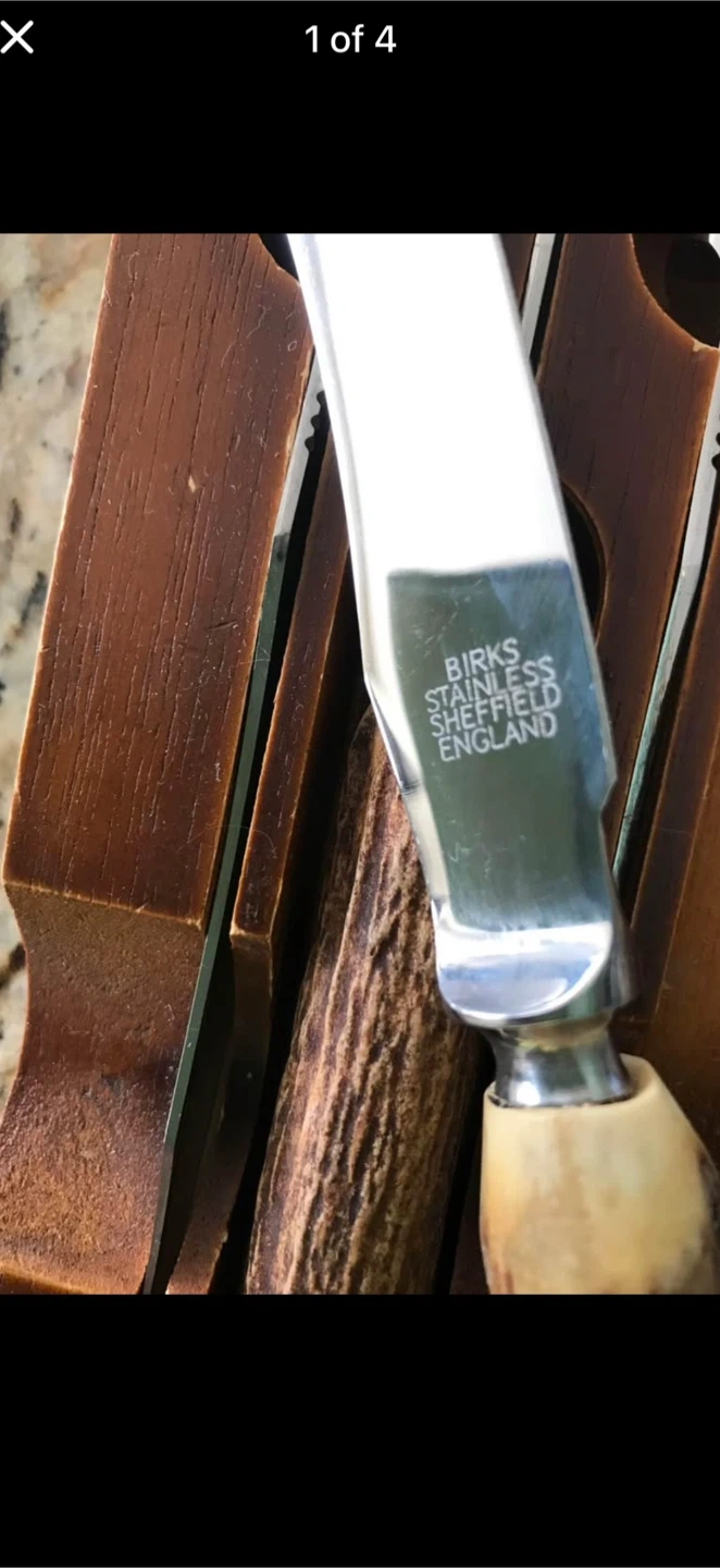 Set of six Birks knives made in Sheffield, England. Features genuine stag handles and stainless steel blades. Comes in a wooden display block. Excellent condition