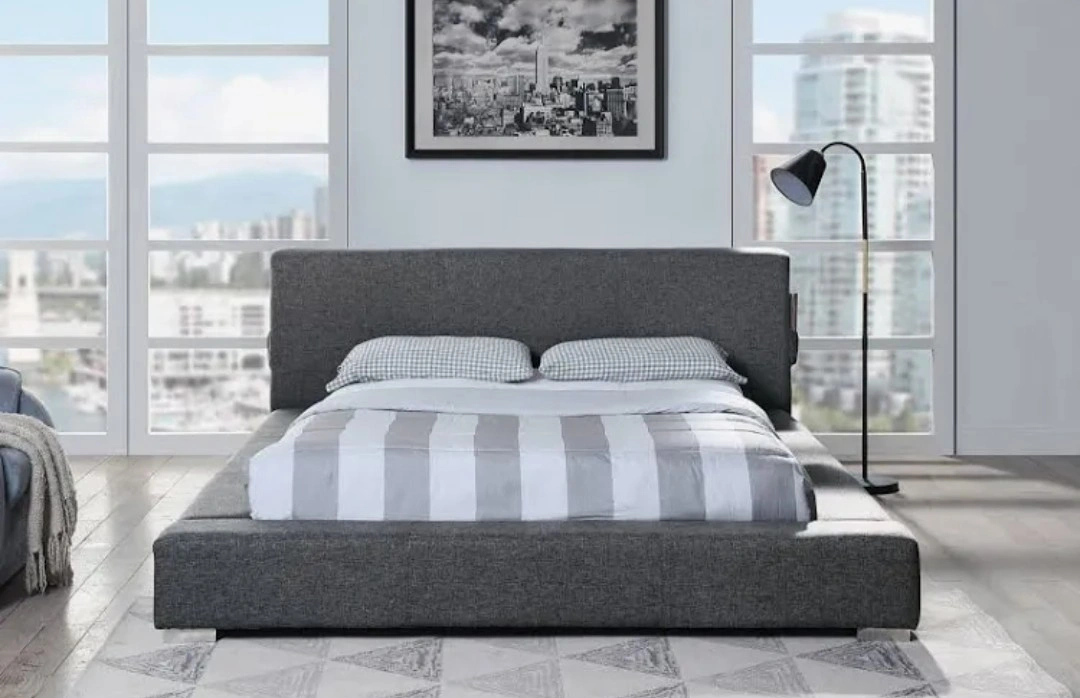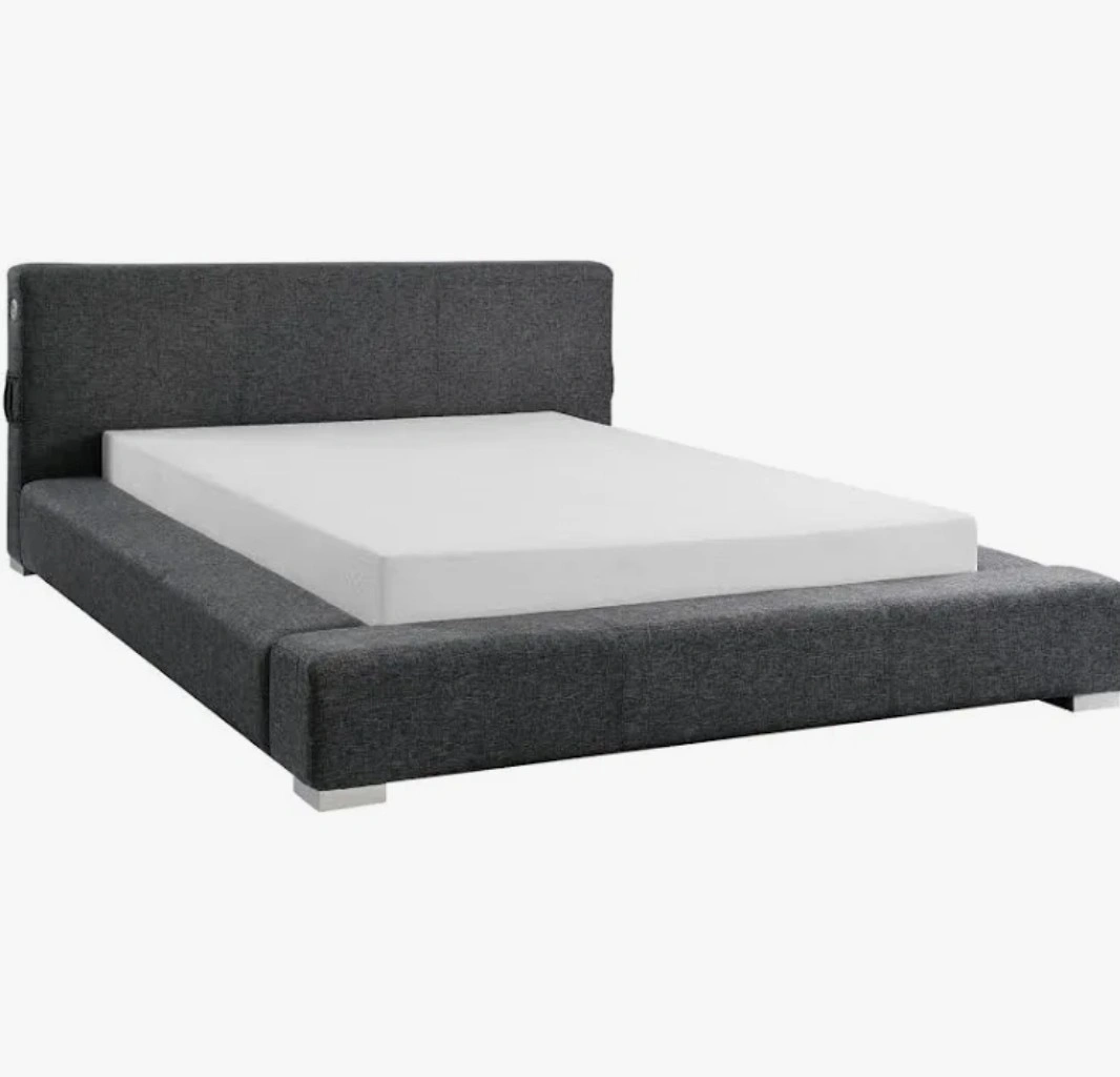This platform bed frame is upholstered in a dark grey fabric. It features a modern design with a low profile and a padded headboard. Includes wooden slats for mattress support.also has charging ports and storage pockets on both sides of the headboard