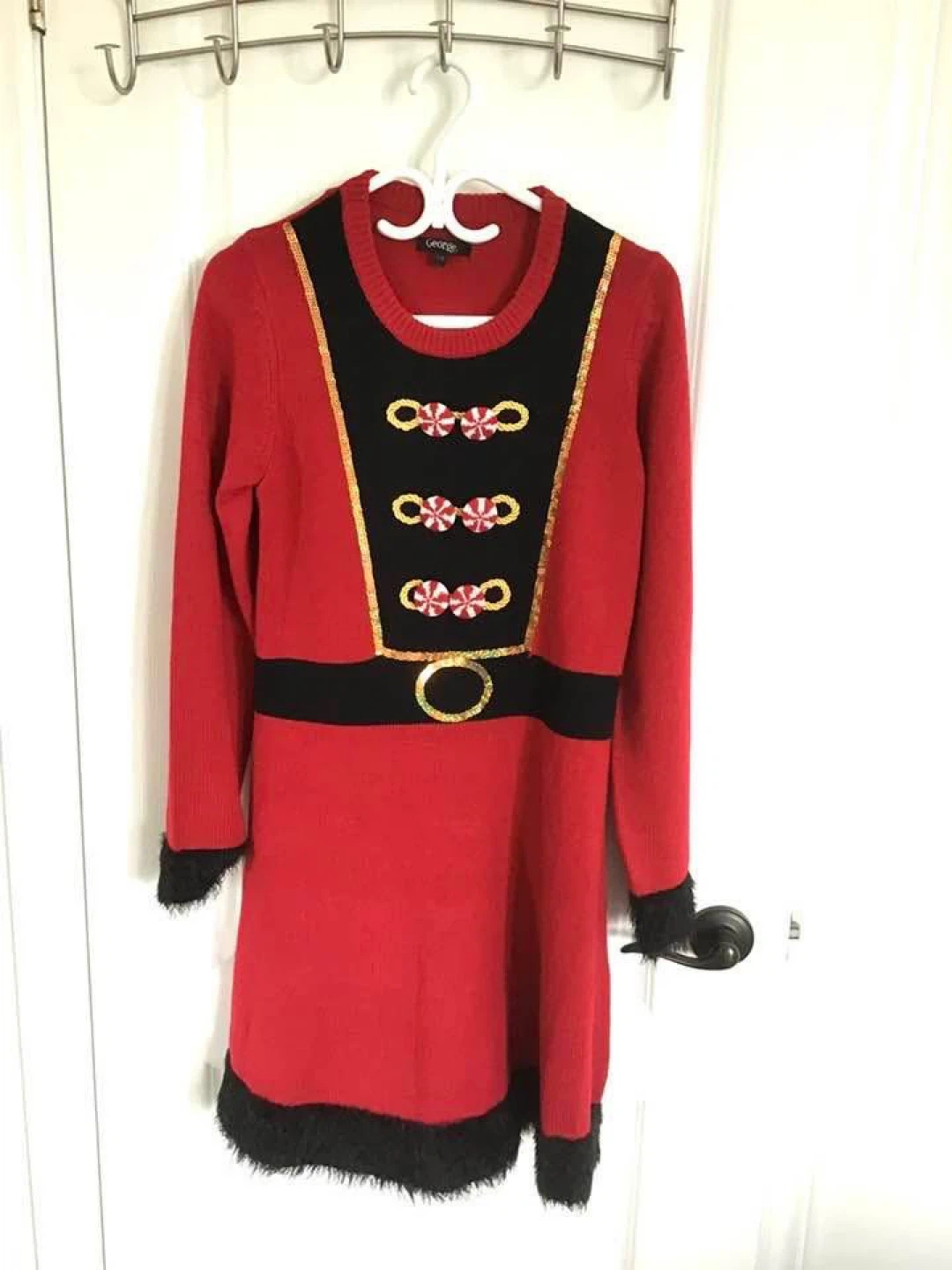 Festive red Christmas sweater dress from George. Size L/G. Features a cute design with black and gold accents, and candy-like embellishments. Perfect for the holiday season!