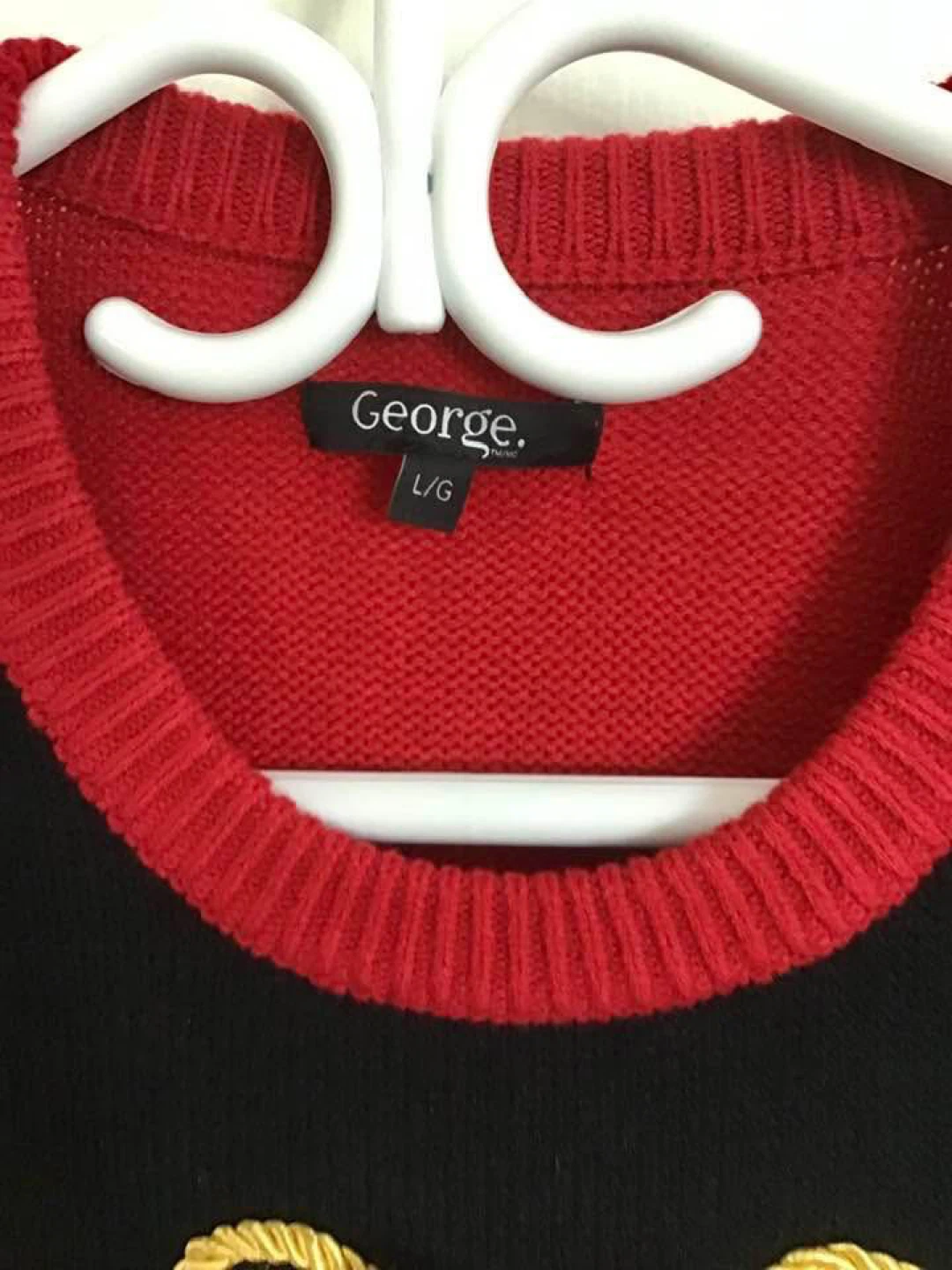 Festive red Christmas sweater dress from George. Size L/G. Features a cute design with black and gold accents, and candy-like embellishments. Perfect for the holiday season!