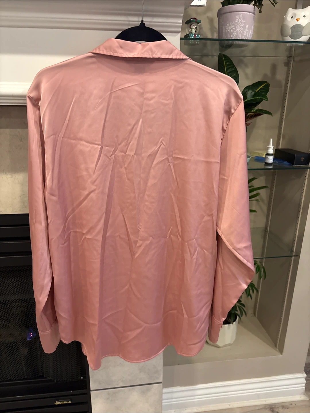 This is a rose pink satin long-sleeve blouse from H&M. It's a size L, fitting EUR L, US L, and CAG L. It's made in Bangladesh from a smooth satin material that drapes nicely.