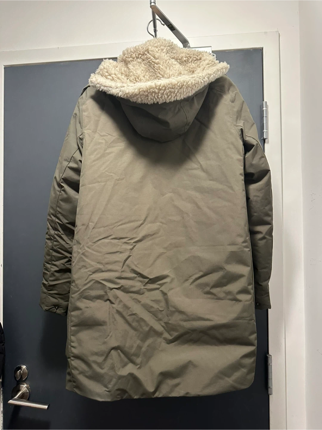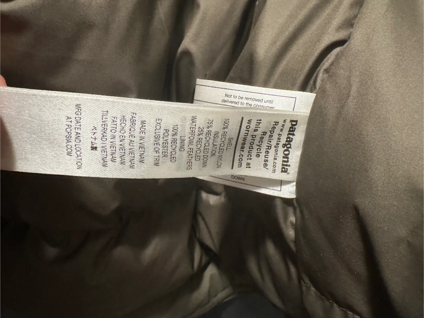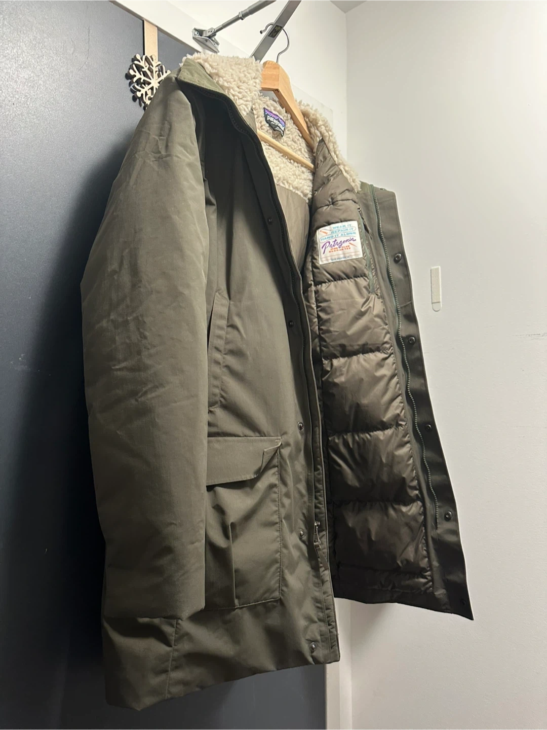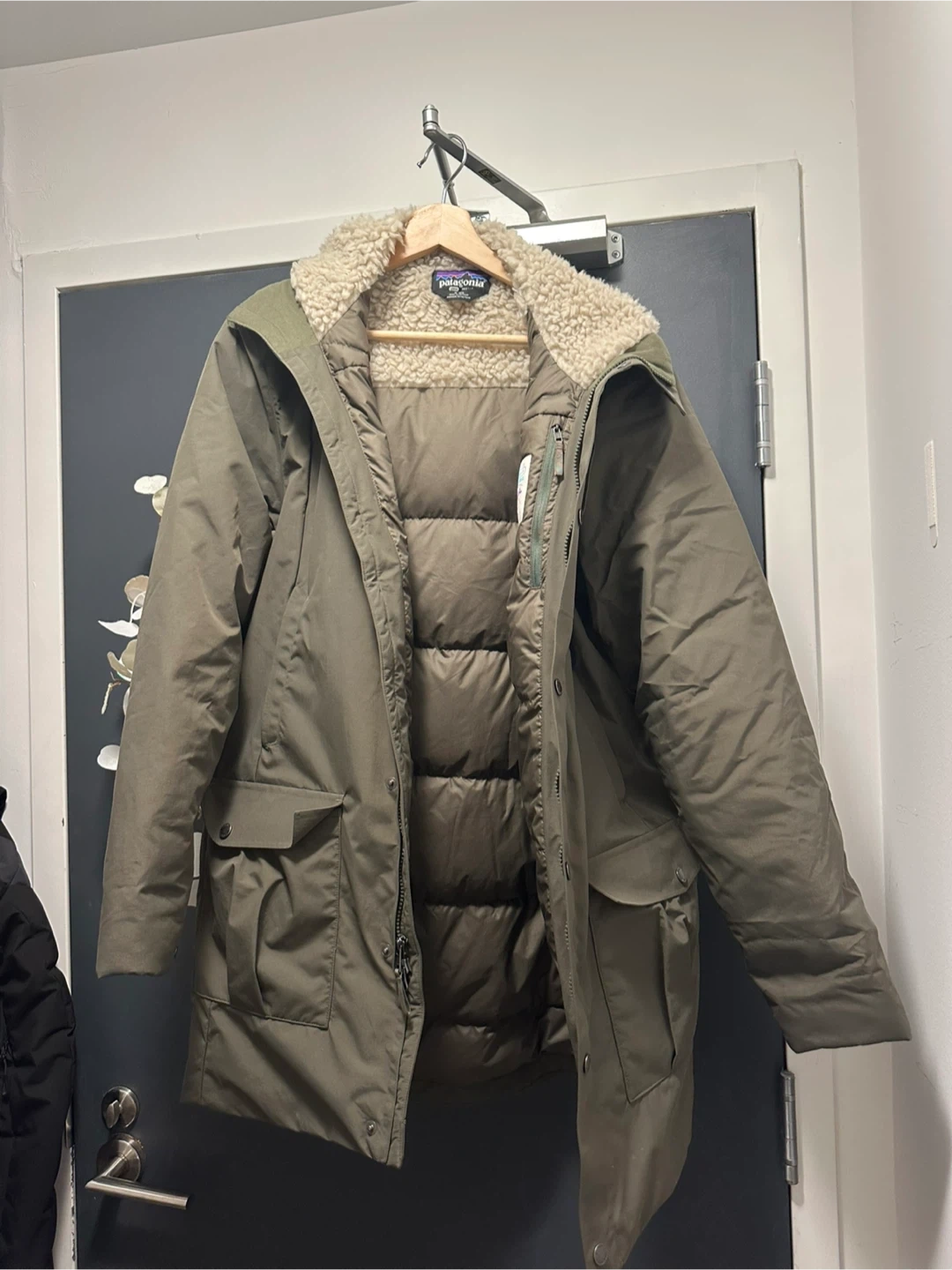 This Patagonia parka is made with a 100% recycled nylon shell and 100% recycled polyester lining. It's filled with 75% recycled down and 25% recycled waterfowl feathers for warmth. The collar and hood are lined with a cozy sherpa material. It's a great jacket for staying warm in colder weather!