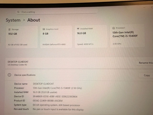 Used - Like new. Processor: Intel Core i5-13400F (10 cores, up to 4.6 GHz). Graphics: NVIDIA GeForce RTX 4060 8GB GDDR6. Memory (RAM): 16GB. Storage: 1TB PCIe Gen4 NVMe SSD. Networking: Wi-Fi 6E, Bluetooth, Gigabit Ethernet. Operating System: Windows 11 Home. Front Ports: USB 3.2 Gen 1 Type A/C, Mic-in/Headphone-out. Rear Ports: USB 2.0, USB 3.2 Gen 1 Type A, HDMI, DisplayPort, Ethernet. Cooling: Included air cooler. Feel free to message if you have any questions!