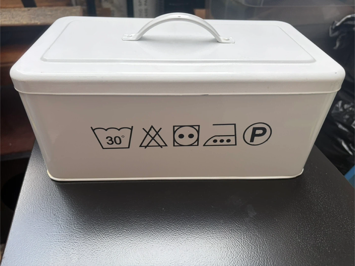 This is a white metal storage tin with a convenient handle. It features laundry care symbols on the side, indicating it's suitable for storing linens or laundry supplies. It's a durable option for keeping items organized.