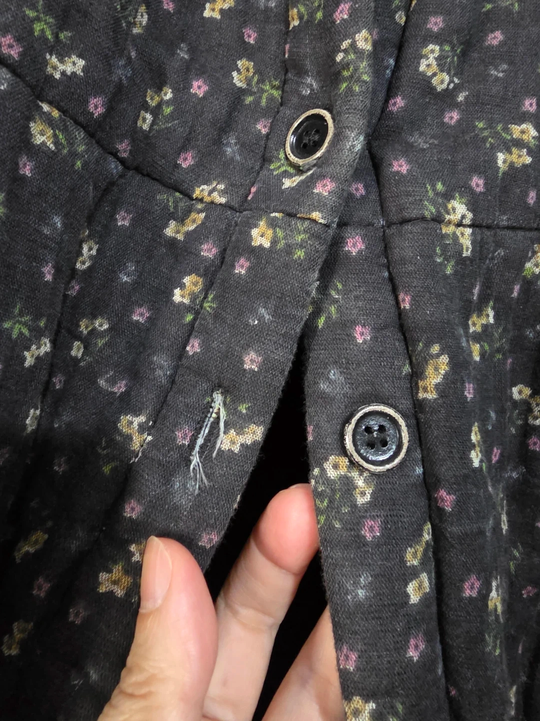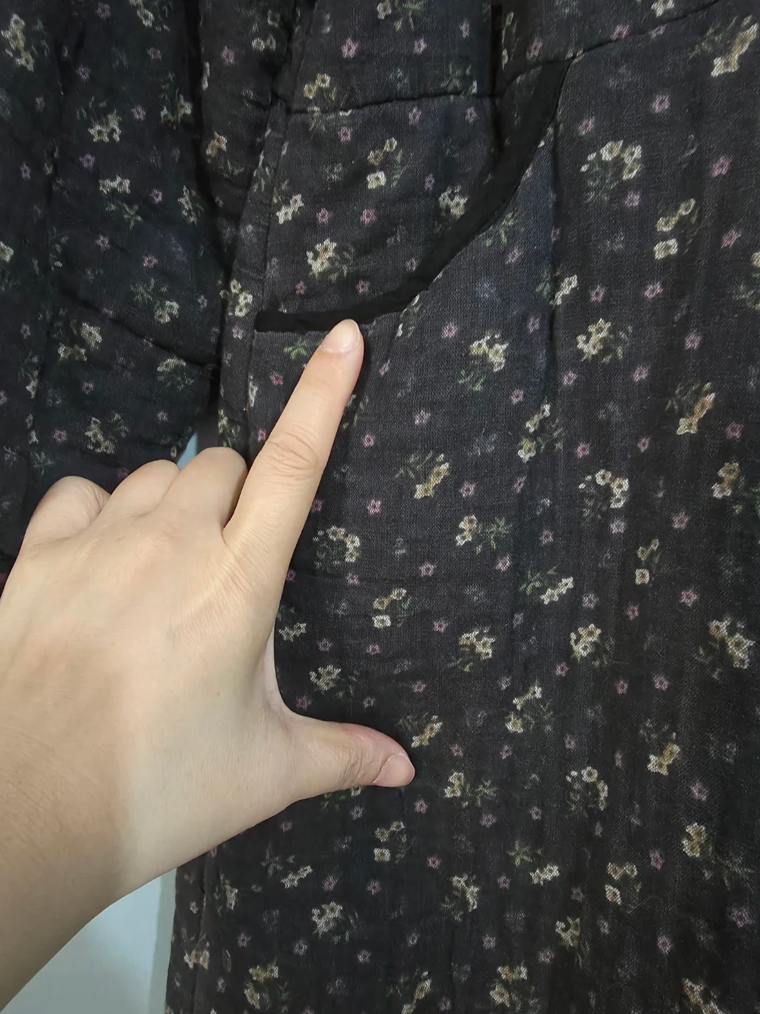 Quilted (cotton padded) jacket with a vintage-inspired floral print. Loose fit and lightweight. It features a lace trim at the hem. The coat has a button-up front and two large pockets. Size M/L. No-brand bought on Amazon.