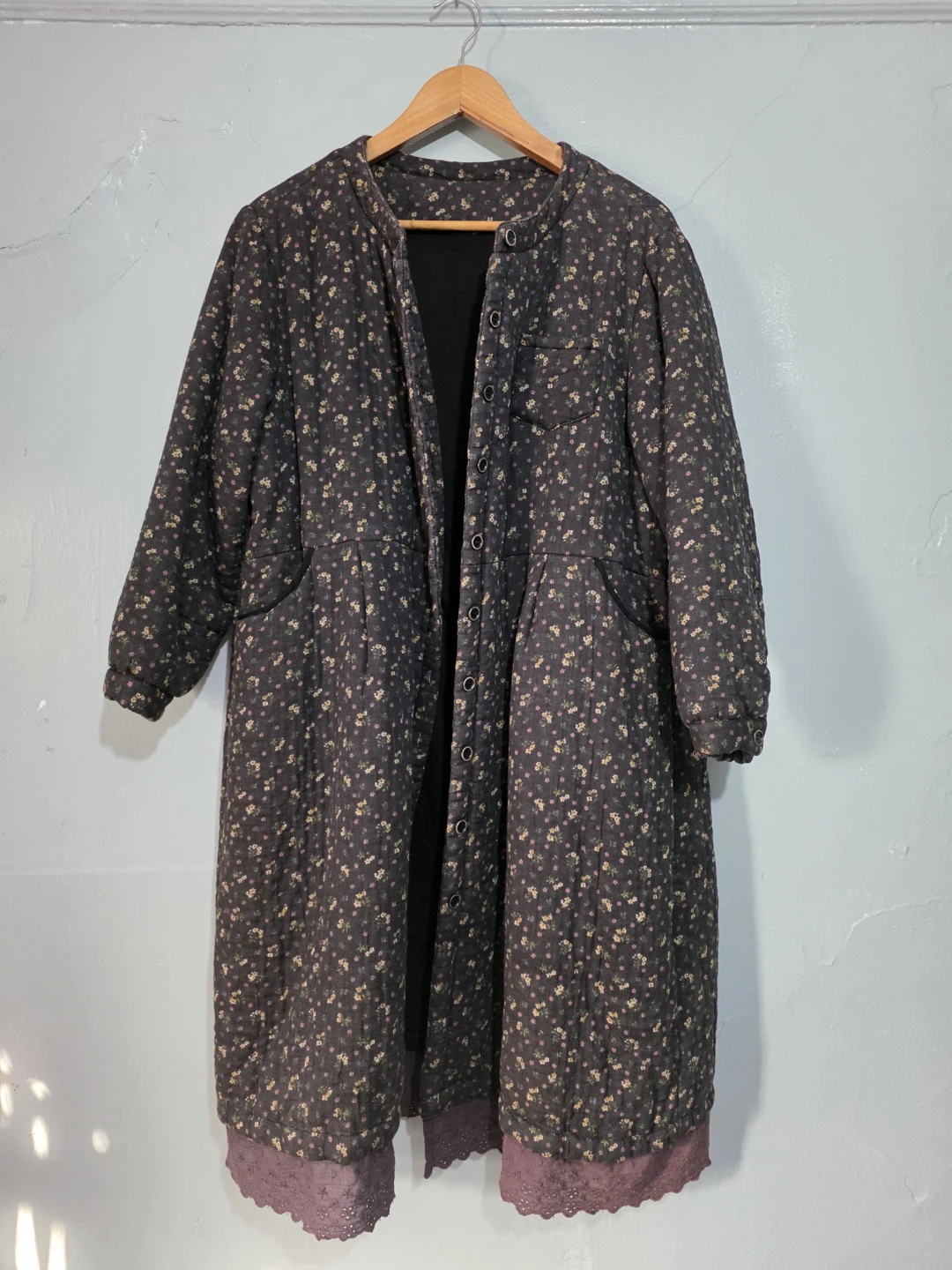 Quilted (cotton padded) jacket with a vintage-inspired floral print. Loose fit and lightweight. It features a lace trim at the hem. The coat has a button-up front and two large pockets. Size M/L. No-brand bought on Amazon.