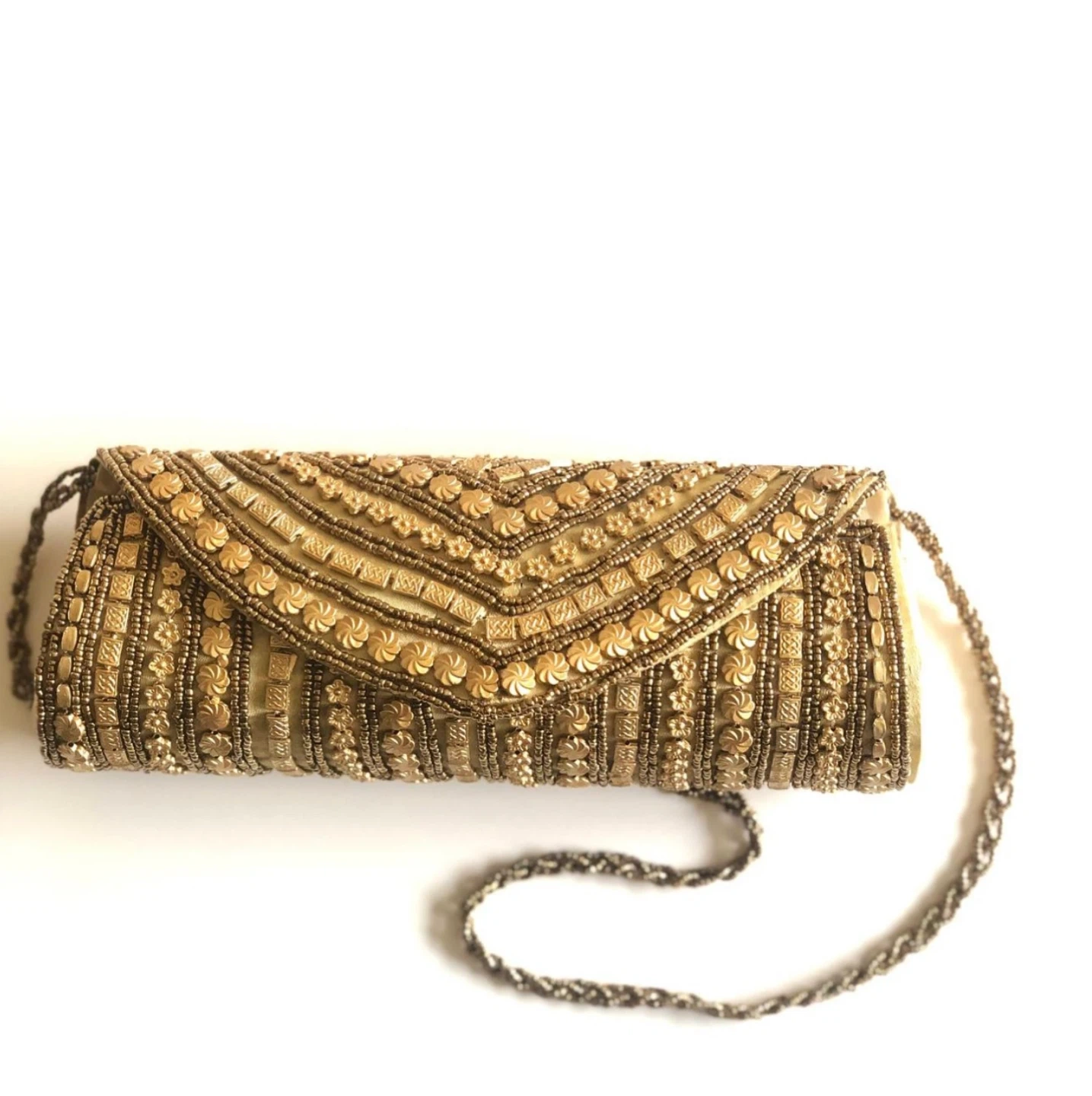 This is a beautiful beaded clutch, perfect for an evening out or special occasion! The gold colour and intricate beadwork make it a standout accessory. It's in great condition and ready to add a touch of elegance to your wardrobe