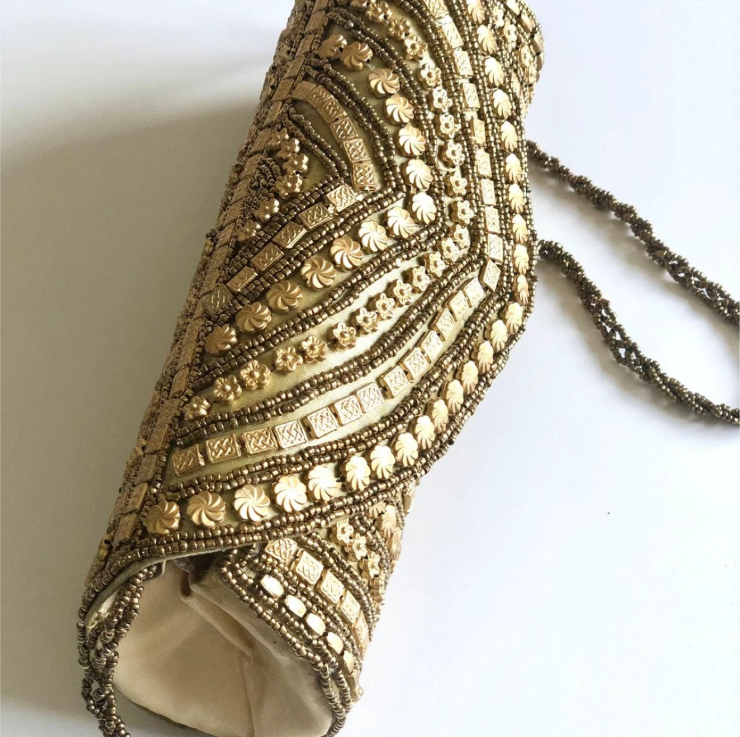 This is a beautiful beaded clutch, perfect for an evening out or special occasion! The gold colour and intricate beadwork make it a standout accessory. It's in great condition and ready to add a touch of elegance to your wardrobe
