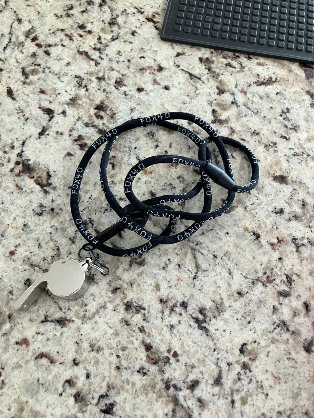 This is a Fox 40 whistle on a black lanyard. The lanyard has 'FOX 40' printed repeatedly. It includes a breakaway clasp for safety. A referee or coach could use this whistle.