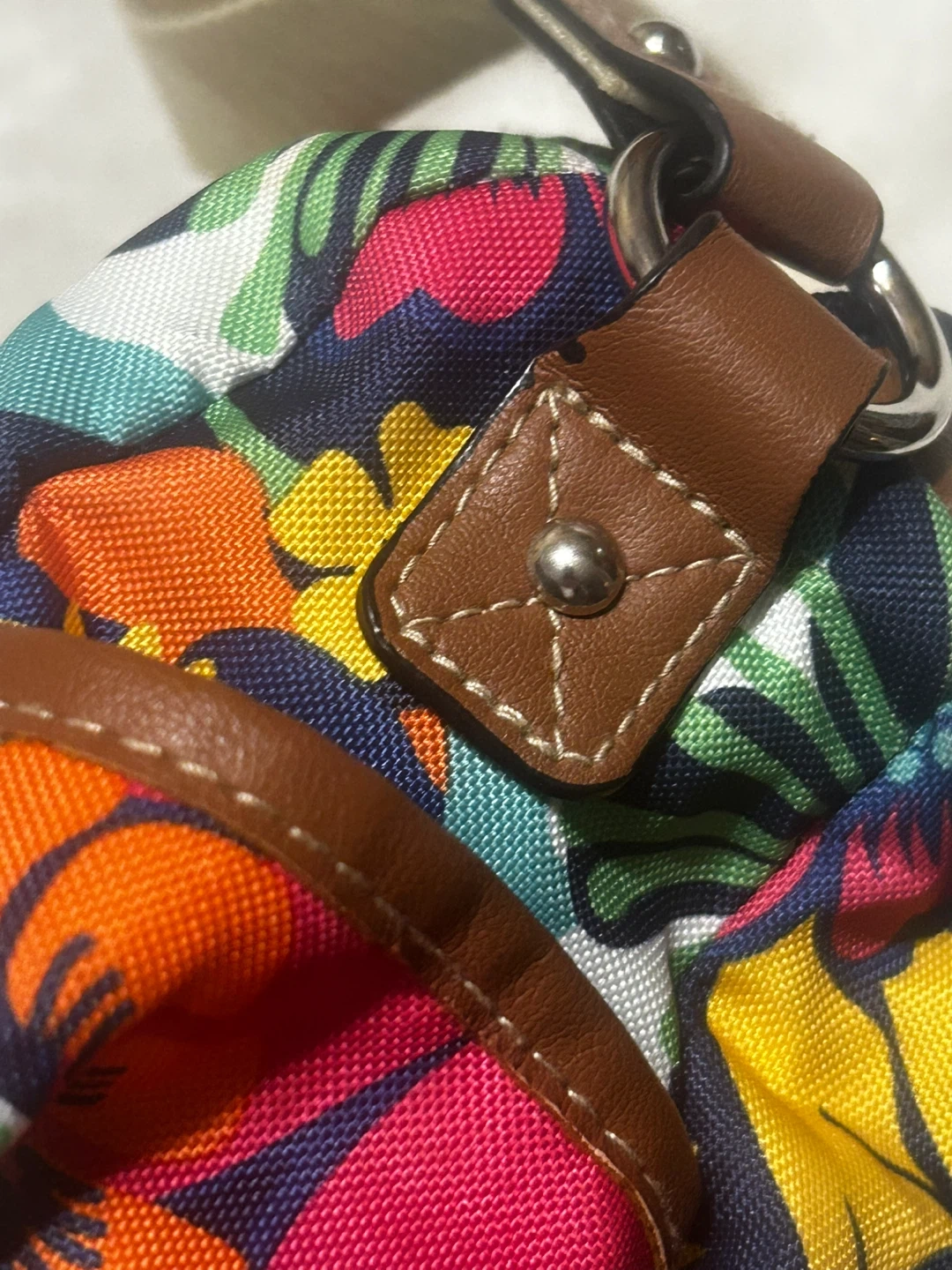 This colourful crossbody bag from Lily Bloom features a vibrant floral print. It has multiple exterior pockets and a zippered main compartment with a bright blue interior. The adjustable strap is made of tan canvas.