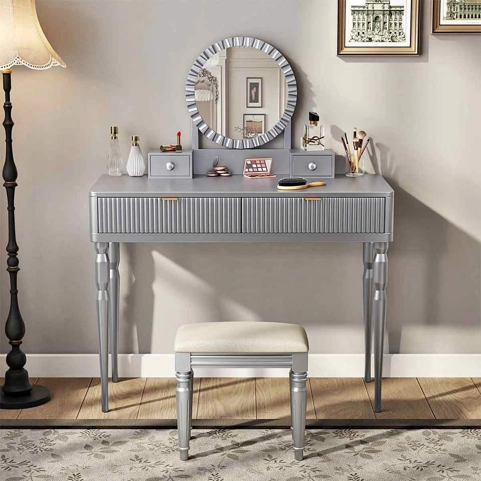 Elegant design with timeless appeal: this vanity table seamlessly blends classic and modern aesthetics, featuring a sunflower-shaped mirror, fluted drawer fronts, and delicately carved table and stool legs. Its simple yet elegant design adds a touch of grace and sophistication to any bedroom, making it an ideal choice for those who appreciate refined style. Dimensions: 29.9'' H X 39.4'' W X 17.7'' D.
