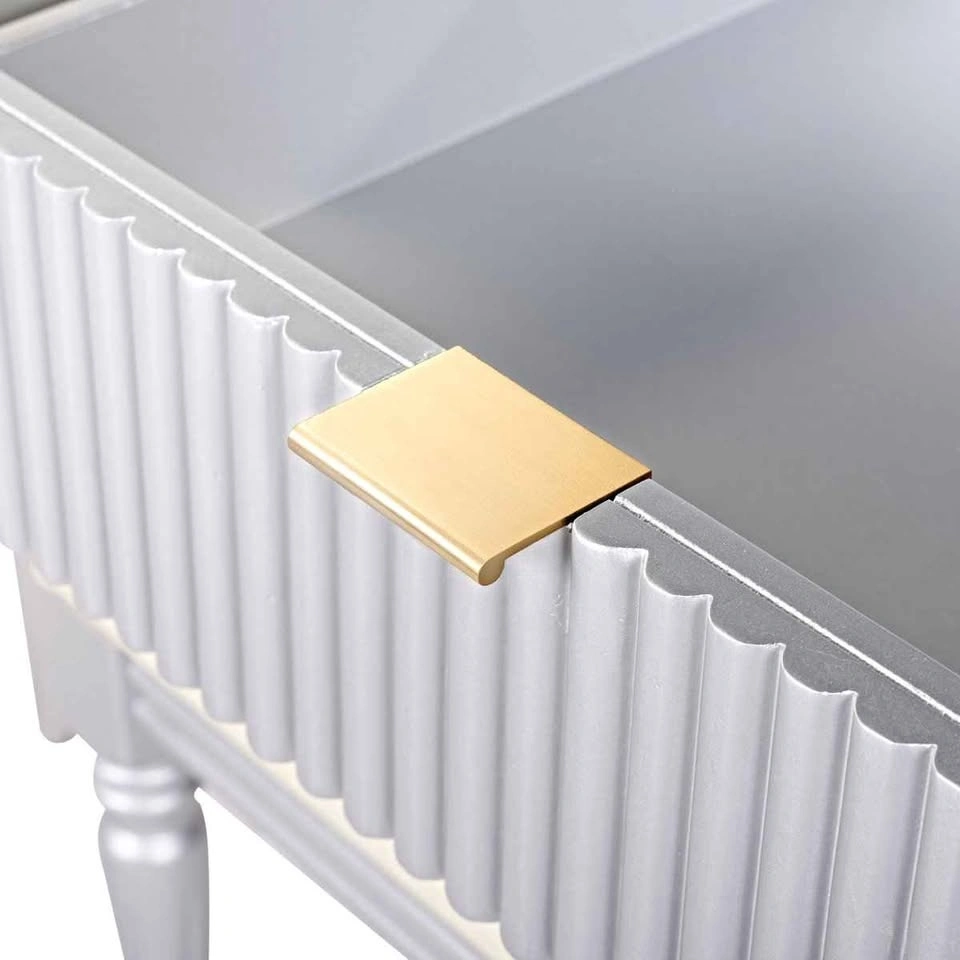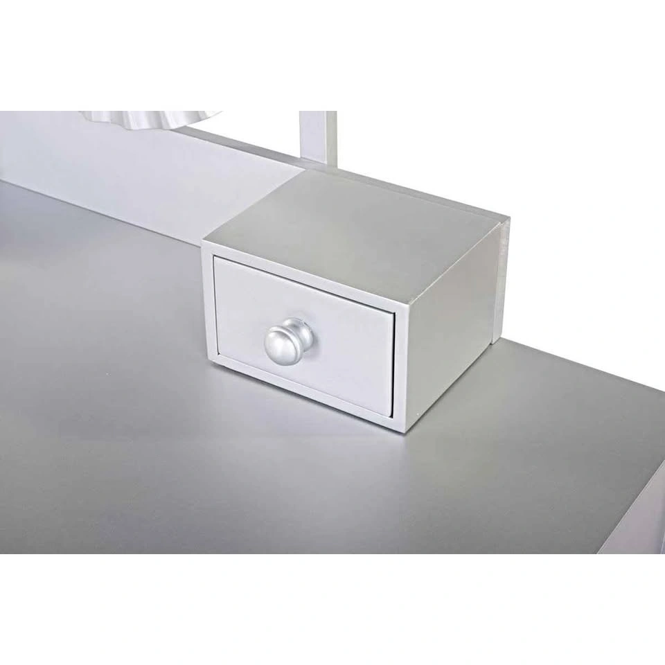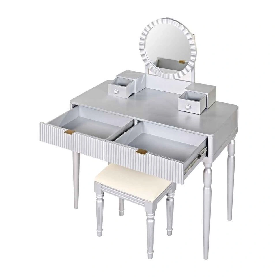 Elegant design with timeless appeal: this vanity table seamlessly blends classic and modern aesthetics, featuring a sunflower-shaped mirror, fluted drawer fronts, and delicately carved table and stool legs. Its simple yet elegant design adds a touch of grace and sophistication to any bedroom, making it an ideal choice for those who appreciate refined style. Dimensions: 29.9'' H X 39.4'' W X 17.7'' D.