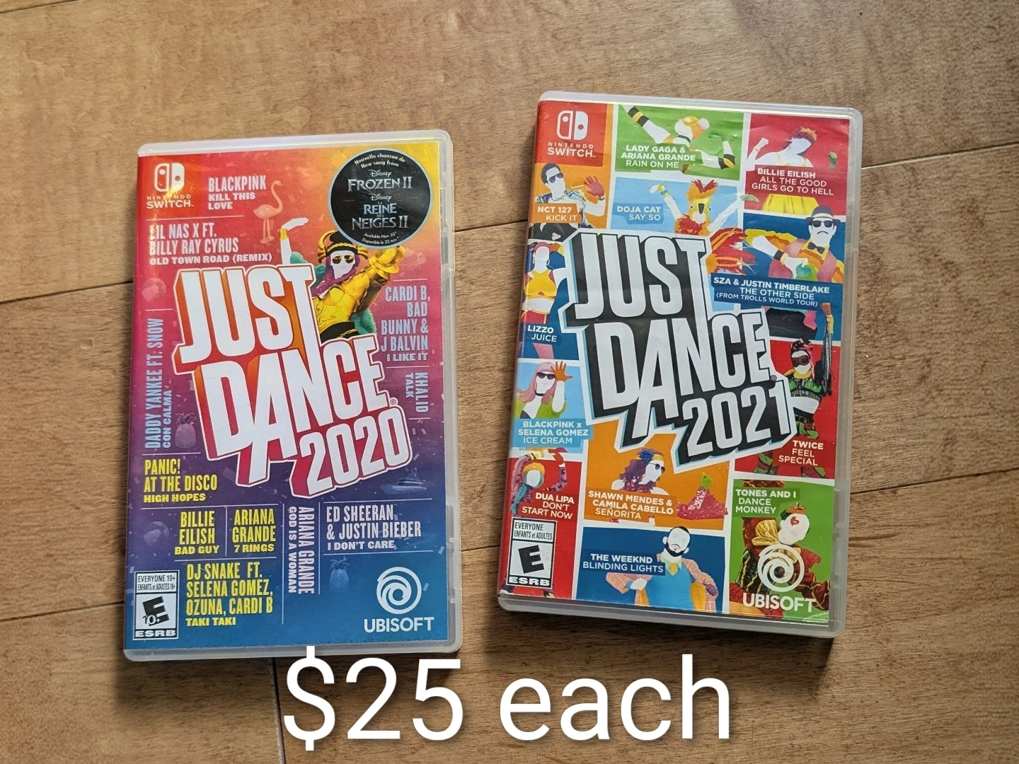Selling two Just Dance games for Nintendo Switch: Just Dance 2020 and Just Dance 2021. These games feature popular artists like Lady Gaga, Billie Eilish, and The Weeknd. Fun for parties and active play!