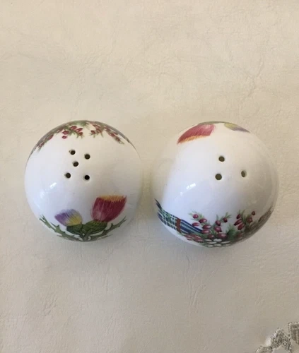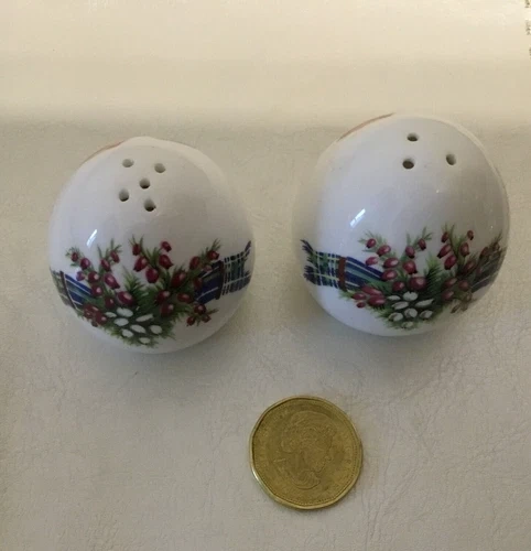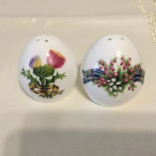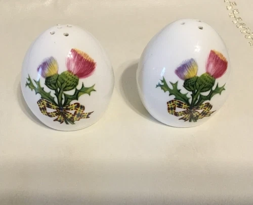 Vintage Sandford England Salt and Pepper Egg Shaped Milk Thistle and Tartan Ribbon Set. Vintage from before 2000. These cute shakers have the thistle on one side and the tartan ribbon on the other side.