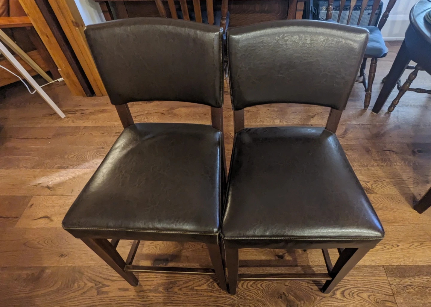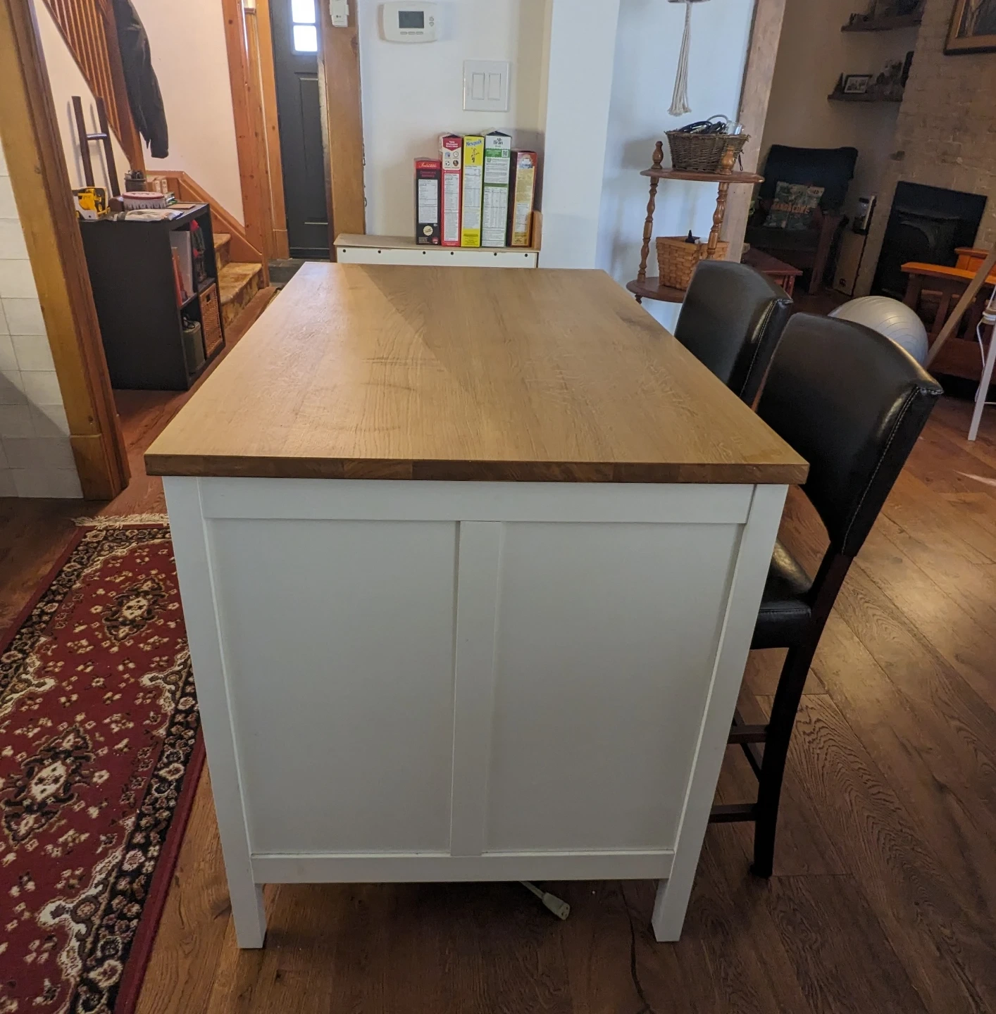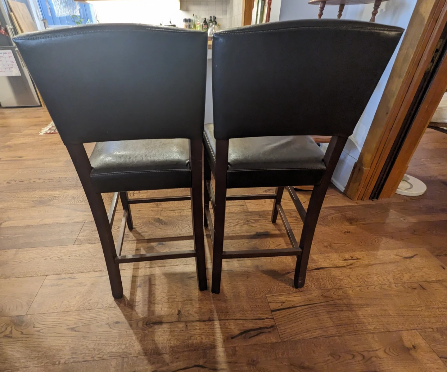Selling a kitchen island with two bar stools. The island has a light wood top and white base. The bar stools are dark brown with padded seats (leather like).