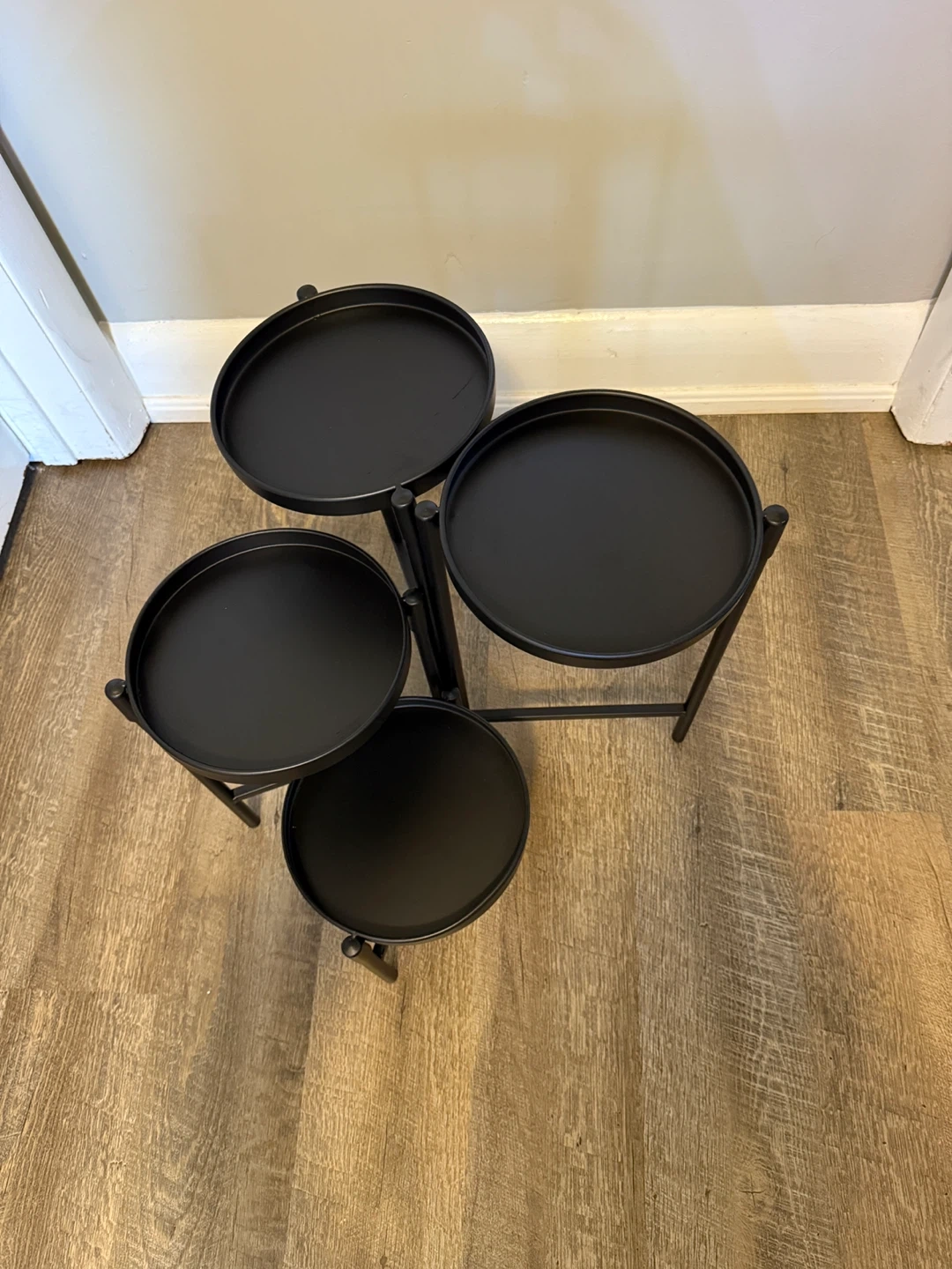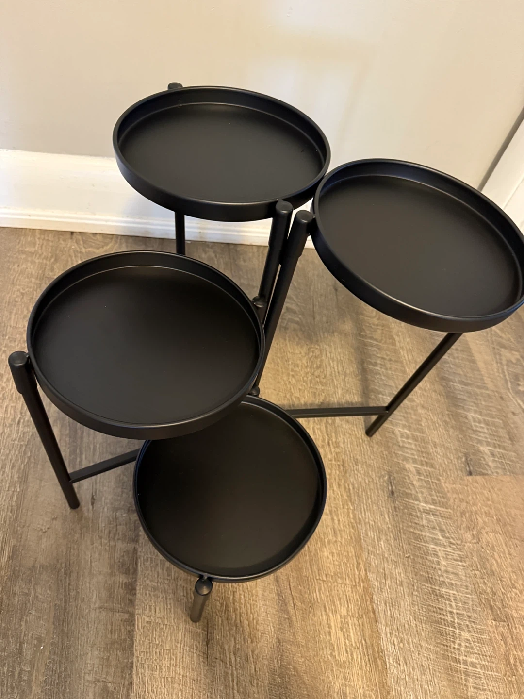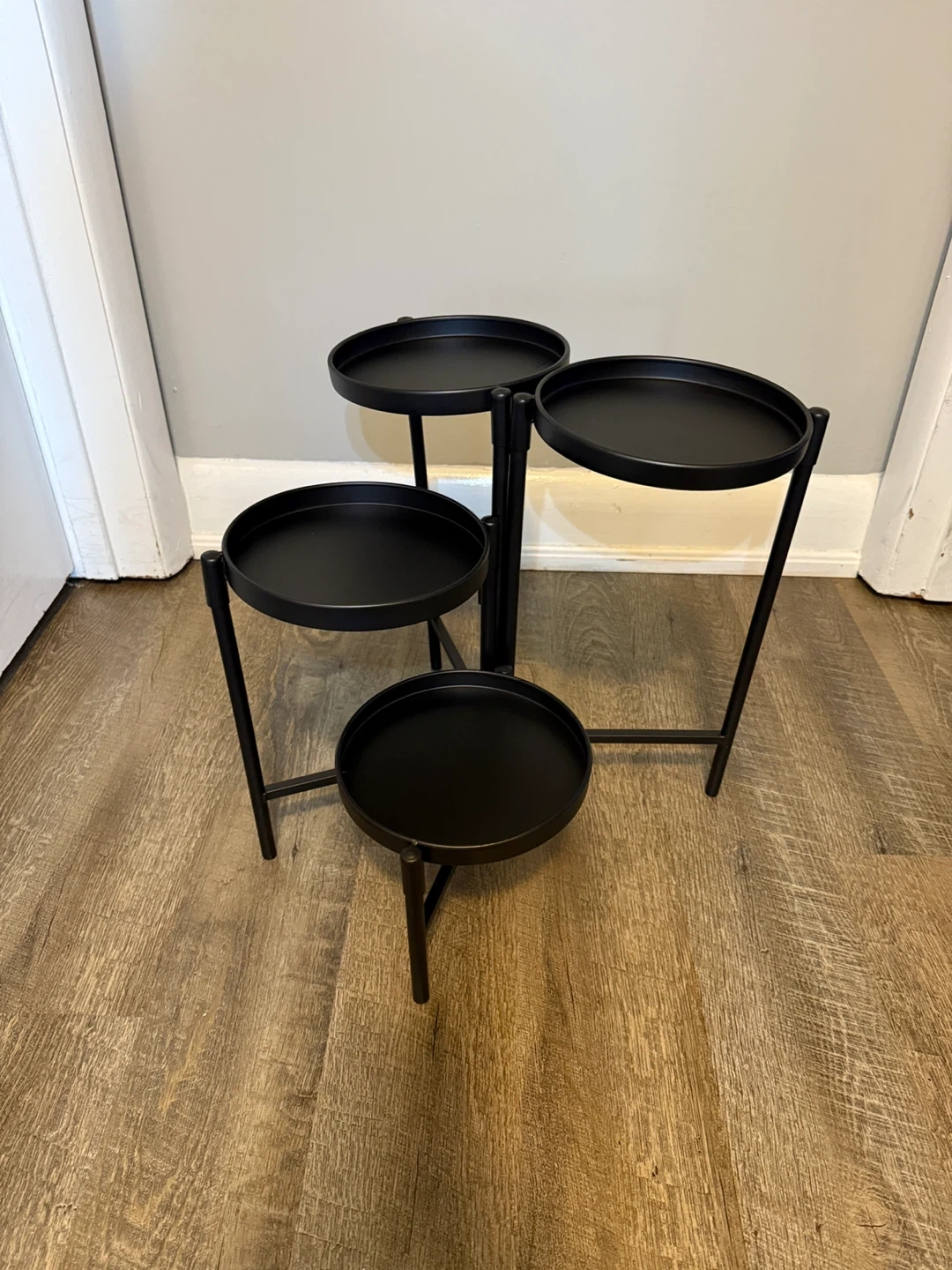 Selling a black metal plant stand with four tiers. It's perfect for displaying your favourite plants in a stylish way. The stand is in great condition and ready to add a touch of greenery to your home!