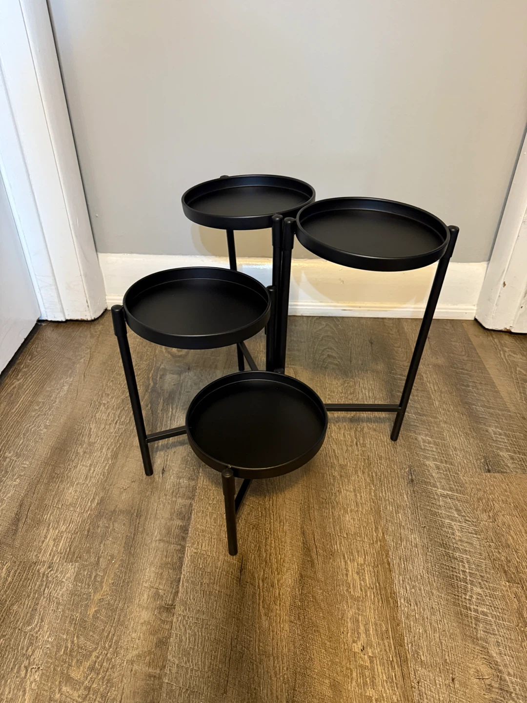 Selling a black metal plant stand with four tiers. It's perfect for displaying your favourite plants in a stylish way. The stand is in great condition and ready to add a touch of greenery to your home!