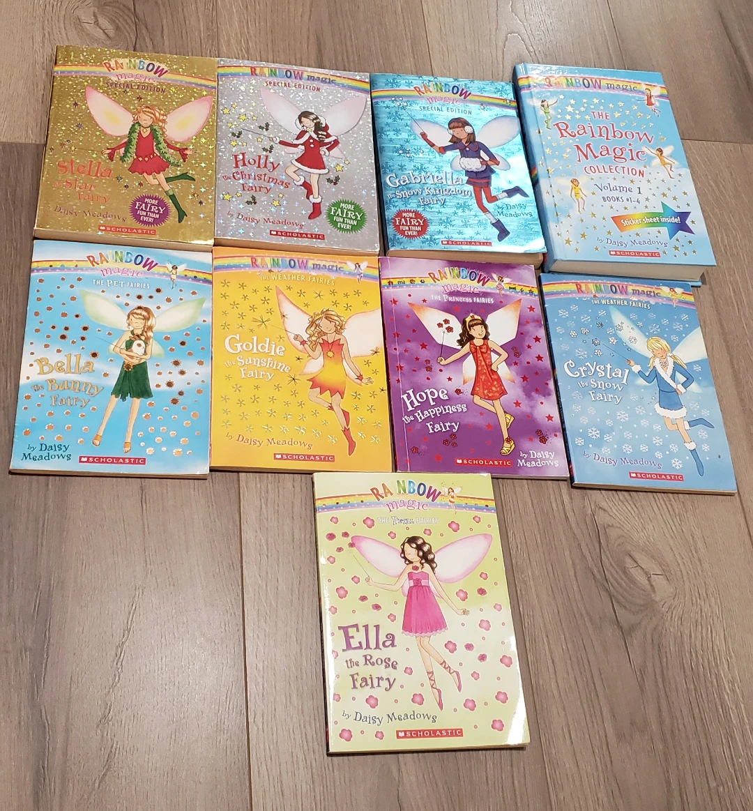 Selling a collection of Rainbow Magic books by Daisy Meadows! Includes special editions like Stella the Star Fairy, Holly the Christmas Fairy, and Gabriella the Snow Kingdom Fairy. Also includes Bella the Bunny Fairy, Goldie the Sunshine Fairy, Hope the Happiness Fairy, Crystal the Snow Fairy, and Ella the Rose Fairy! Perfect for young readers who love fairies and magical adventures. $5 for each book!