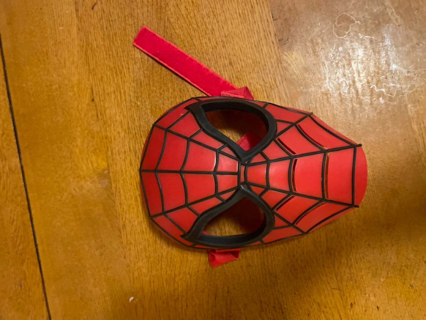 Red and black plastic Spider-Man mask. Features an elastic band. Great for pretend play or costume parties.