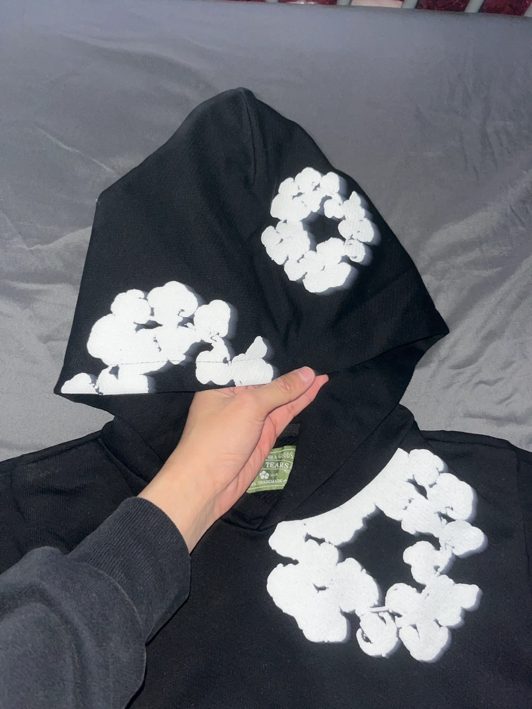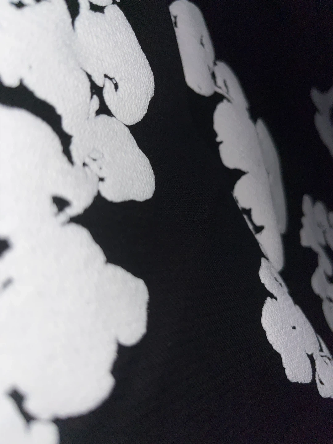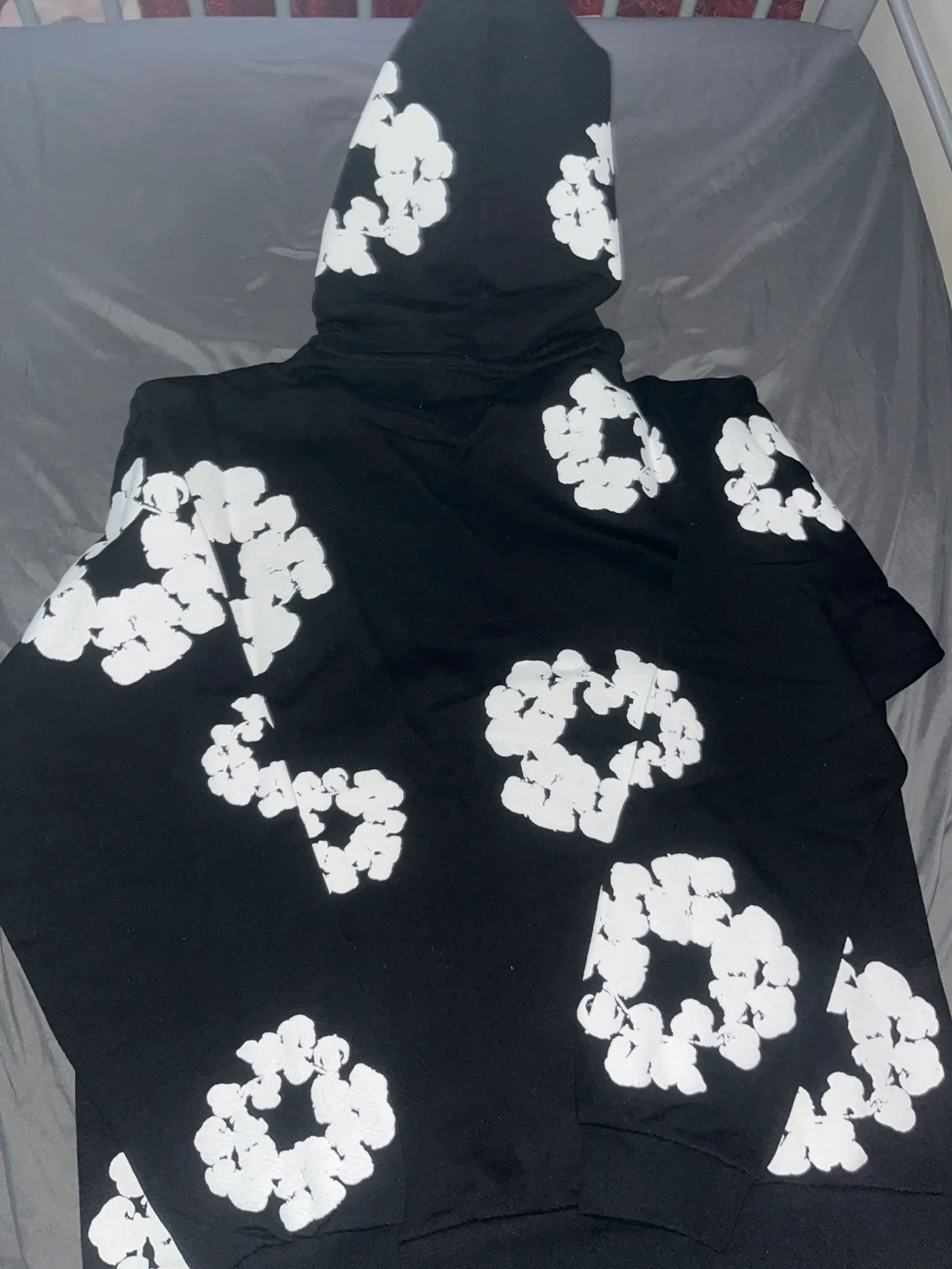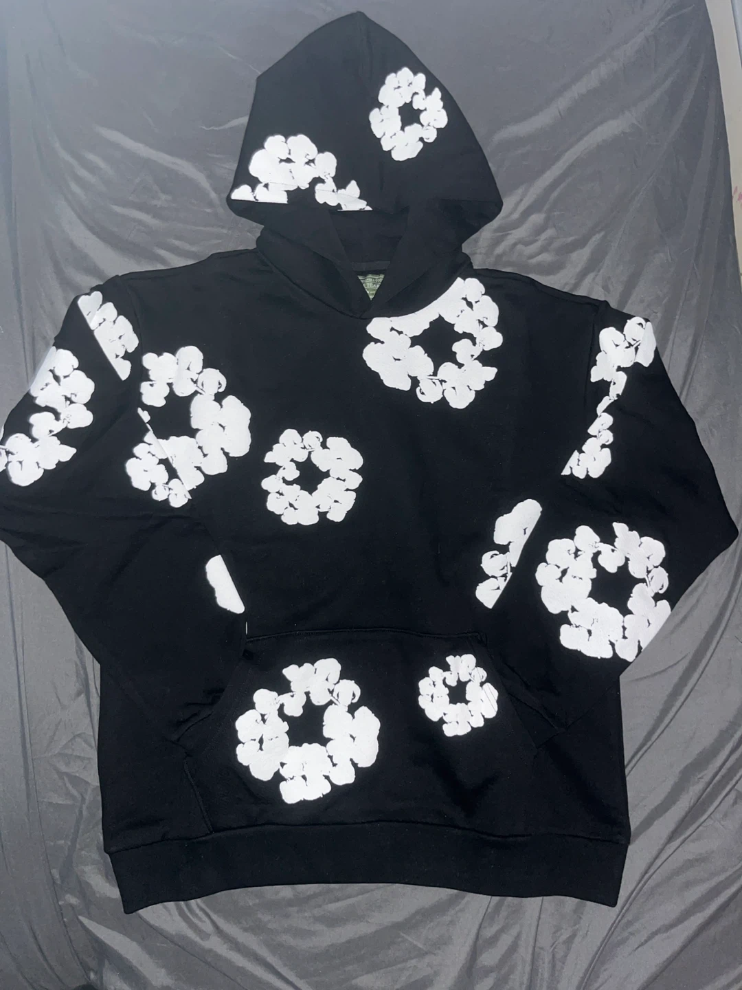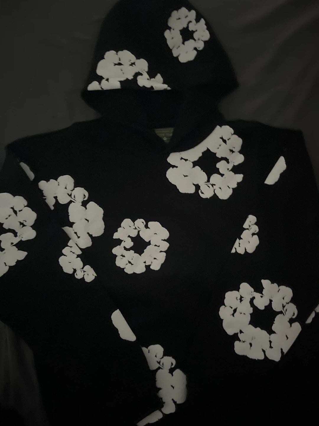 This black hoodie features a white floral graphic print all over. It's made from a soft, comfortable material. Size medium, made in Portugal. From denim tears