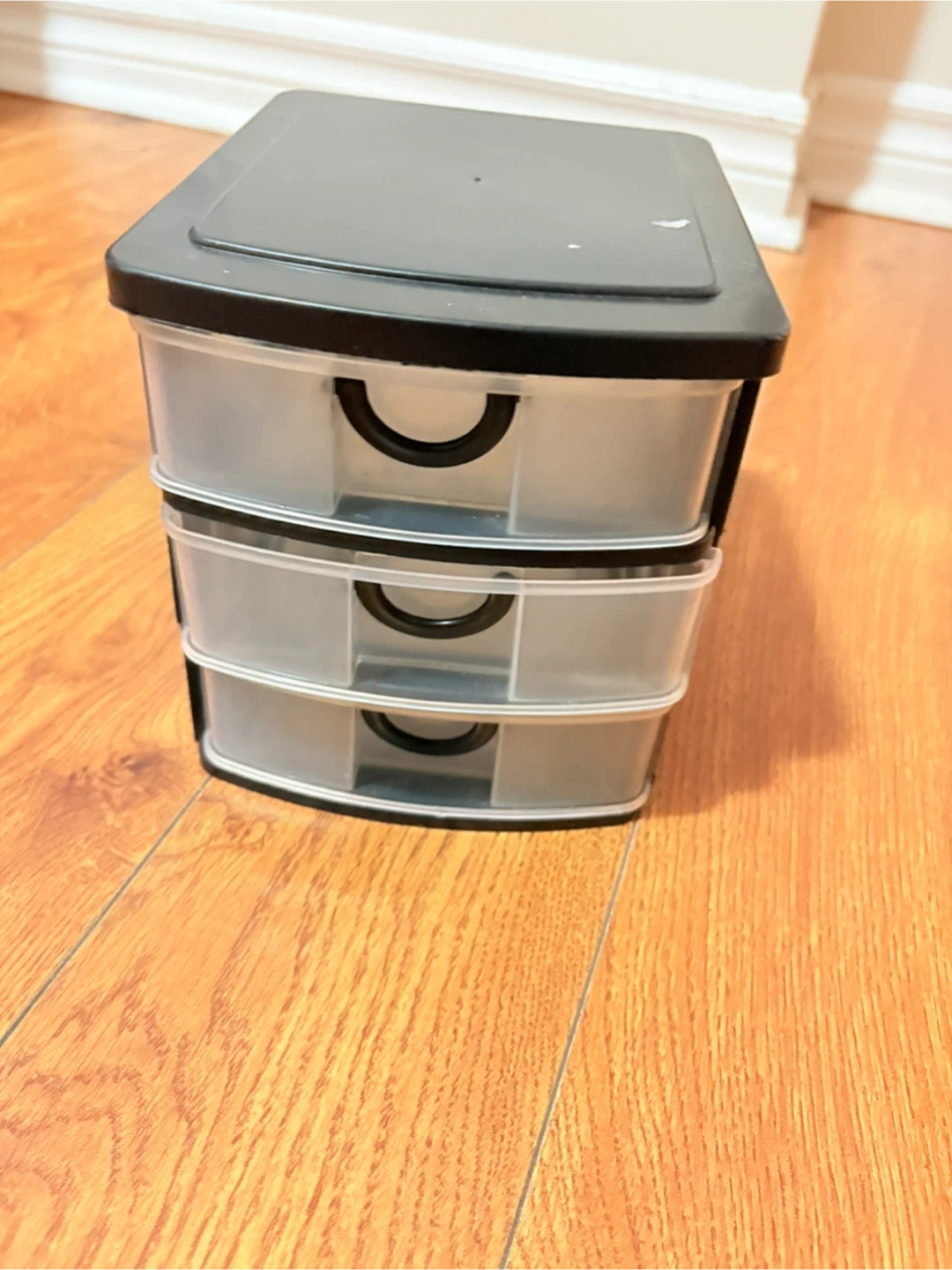This is a 3-drawer storage organizer unit. It's made of clear plastic drawers with a black frame and lid. Great for small items like craft supplies or office accessories.