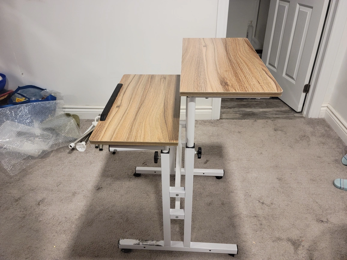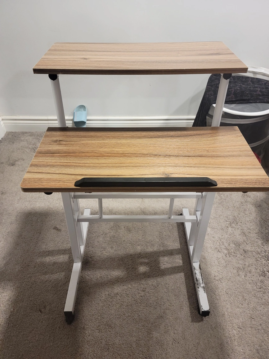 Two-tier adjustable standing desk. Good condition, some minor scratches.