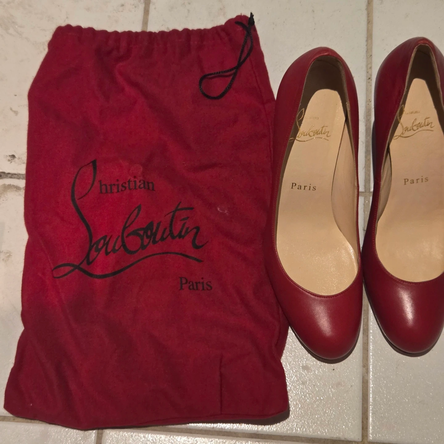 Classic red leather pumps from Christian Louboutin. Made in Italy. Almost new, only worn once. There’s a small scratch on the heel from the sidewalk, so I’m letting them go for a lower price. Great deal if you don’t mind the tiny mark! Size 6.