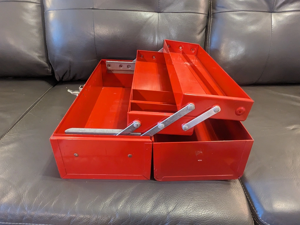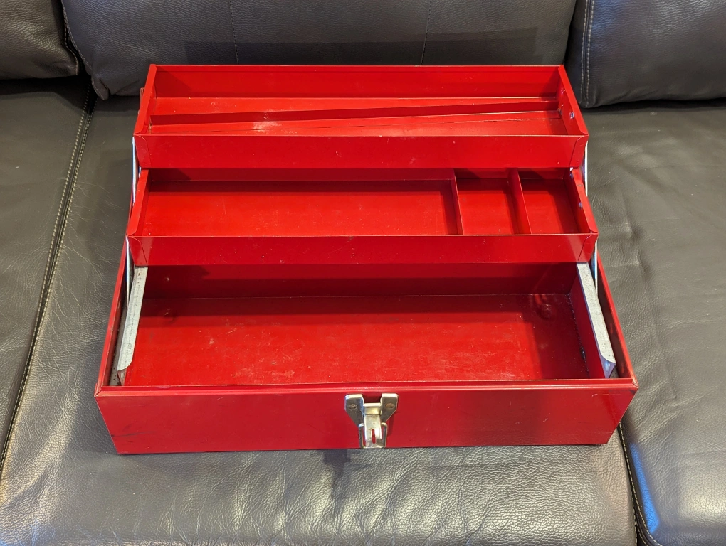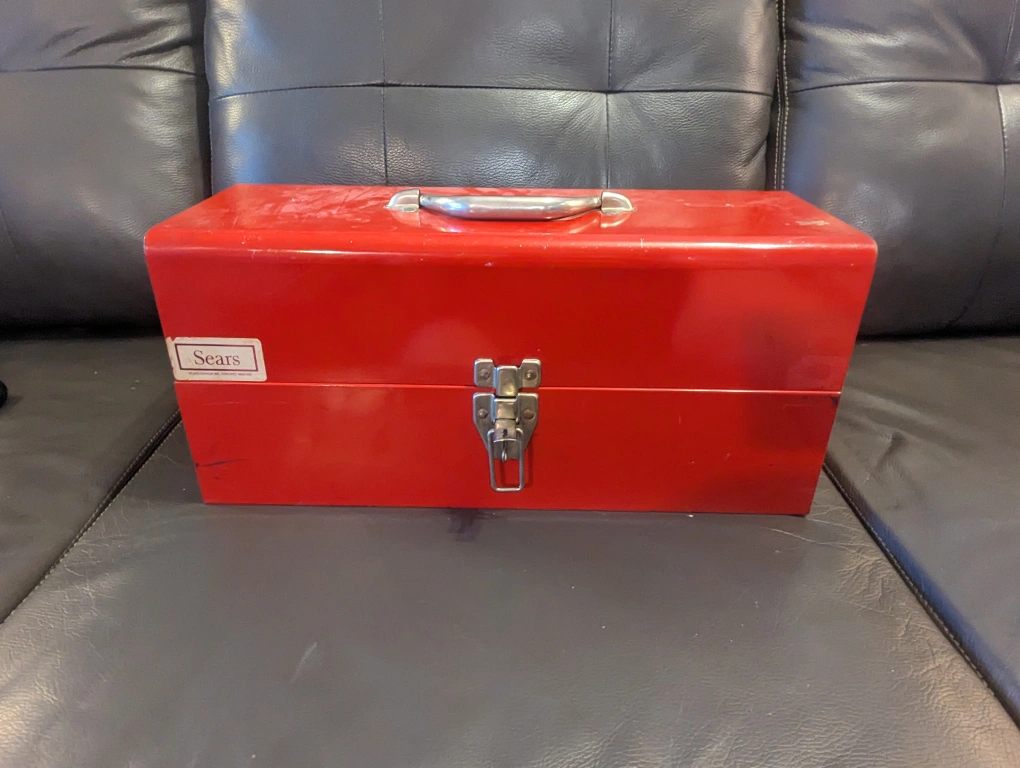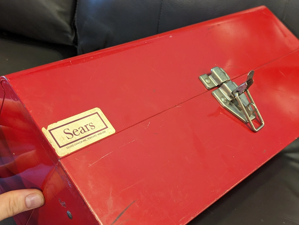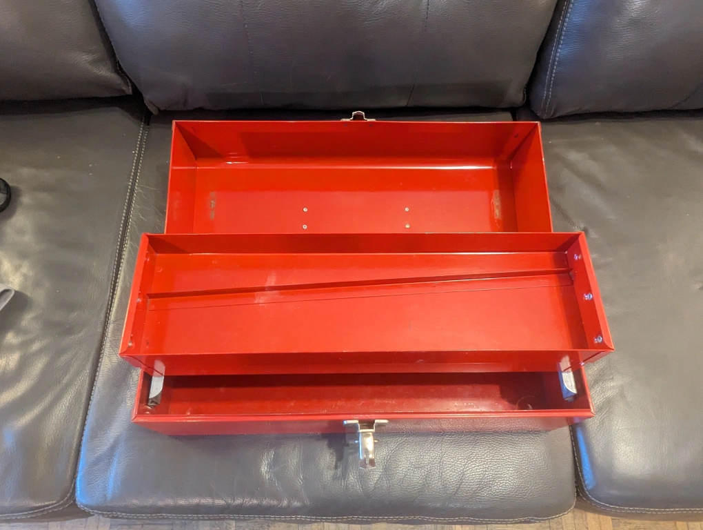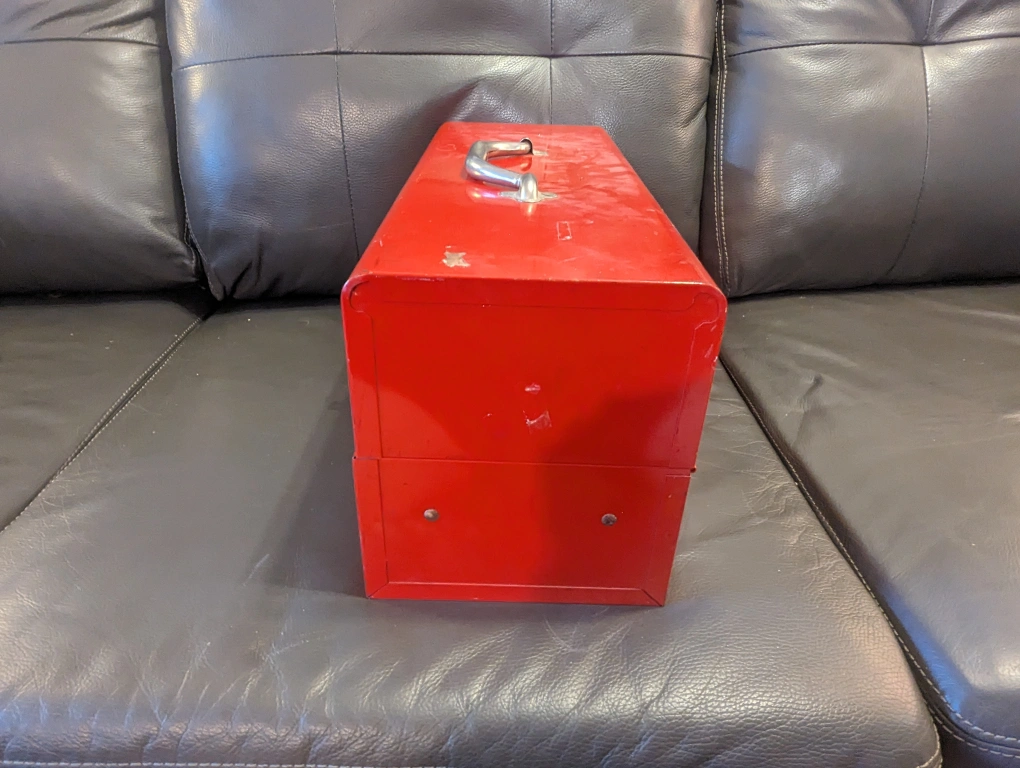 a few nicks and scratches, still sturdy as heck. similar model metal toolboxes go for $40+tax eg Canadian Tire.