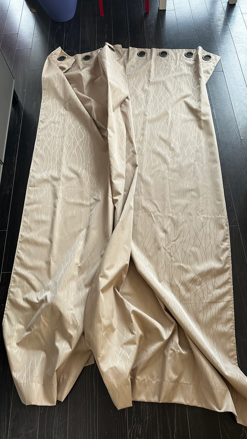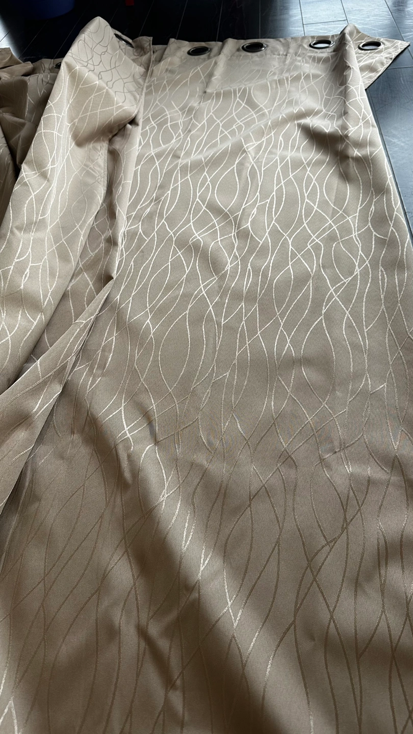 Beige curtains with a slightly metallic pattern. These curtains have grommets at the top for hanging.