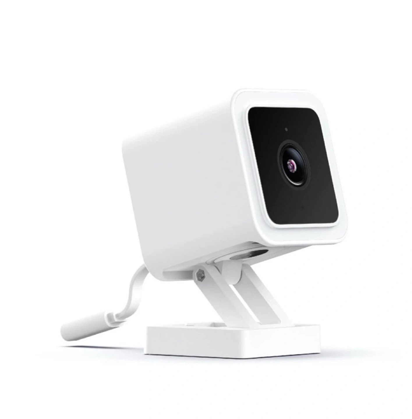 This is a Wyze Cam v3, a white indoor/outdoor video camera. It's a smart home security device. It's powered by USB and supports microSD card storage.