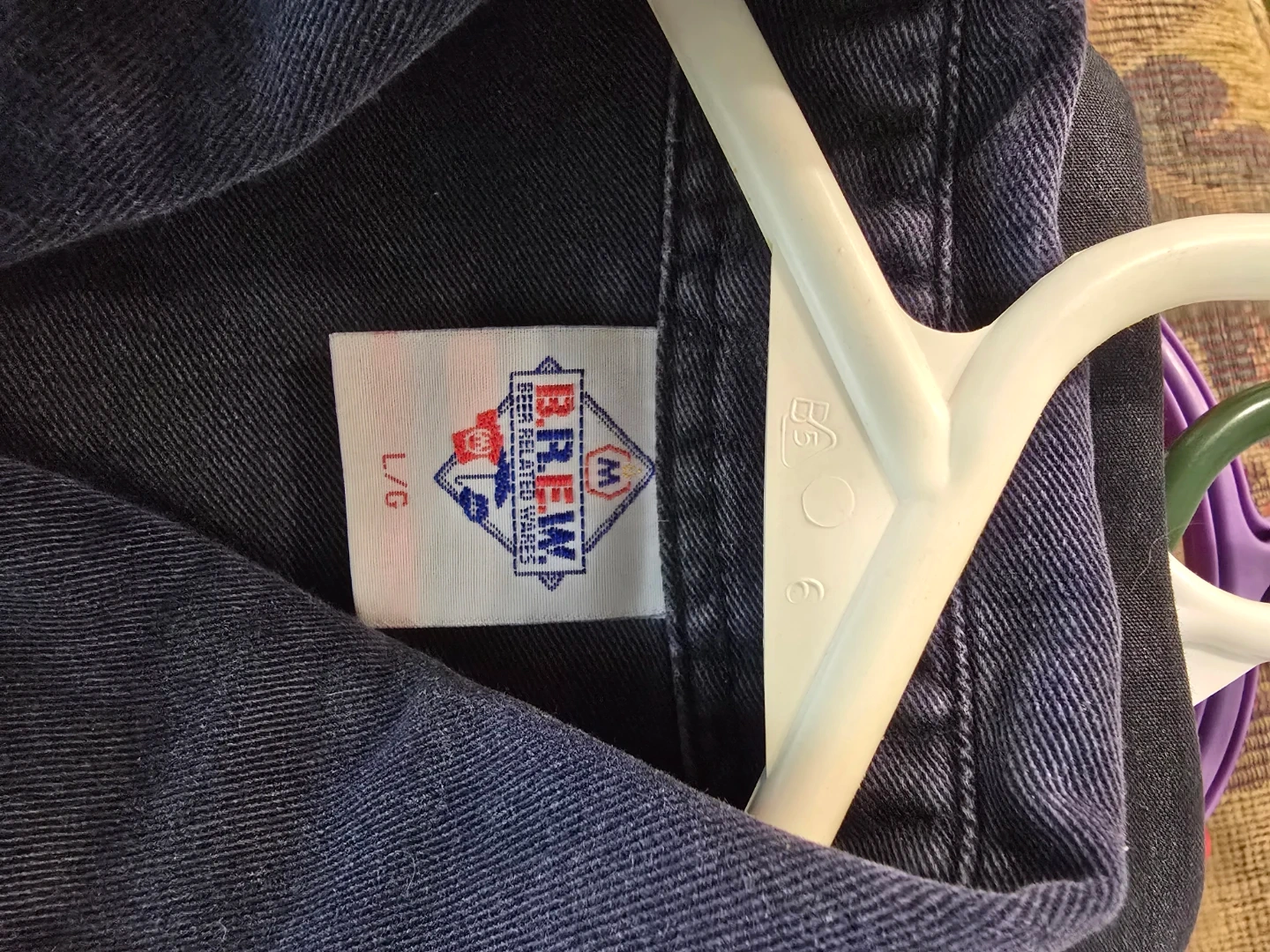 Brew "Extra Old Stock" navy work shirt. Size L/G. Features two chest pockets and button-up front. It's a durable cotton blend for everyday wear.