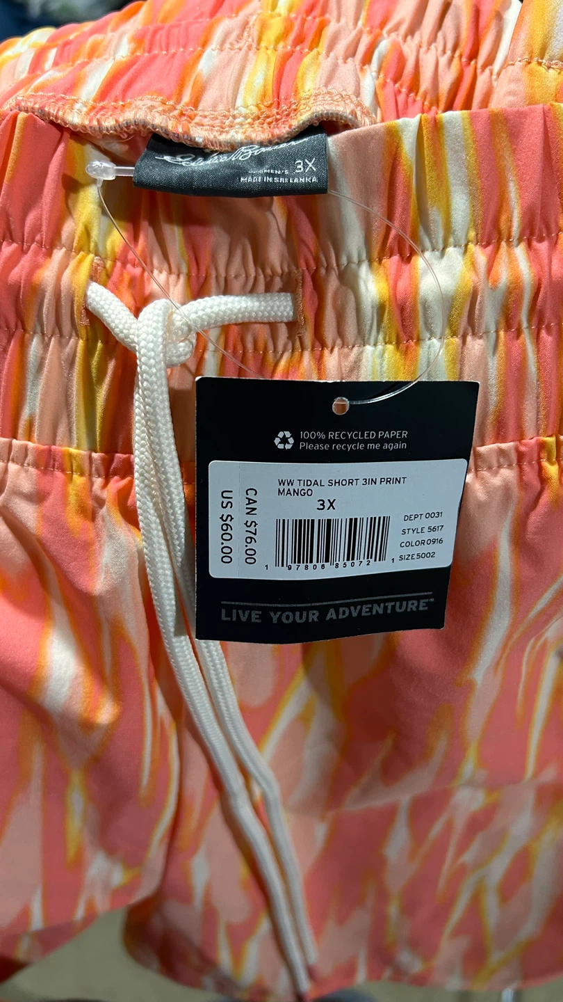 I'm selling a brand new pair of Eddie Bauer Tidal Shorts in a fun, vibrant print! These shorts are a size 3X and feature a comfortable 3-inch inseam. They have a handy zipper pocket at the back. New with tags. Perfect for your winter getaway!