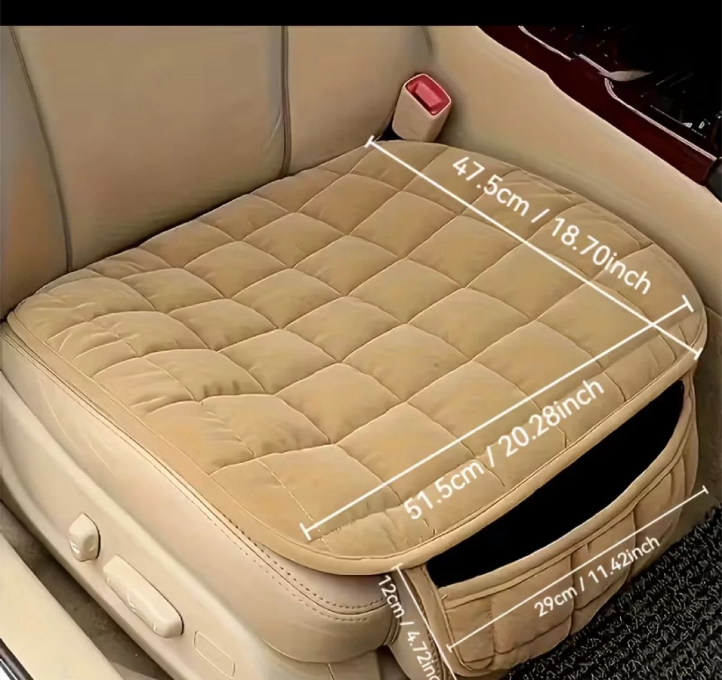 Selling a car seat cushion in beige. It's in great condition and ready to use! It measures approximately 47.5cm x 51.5cm.it has pocket for your belongings