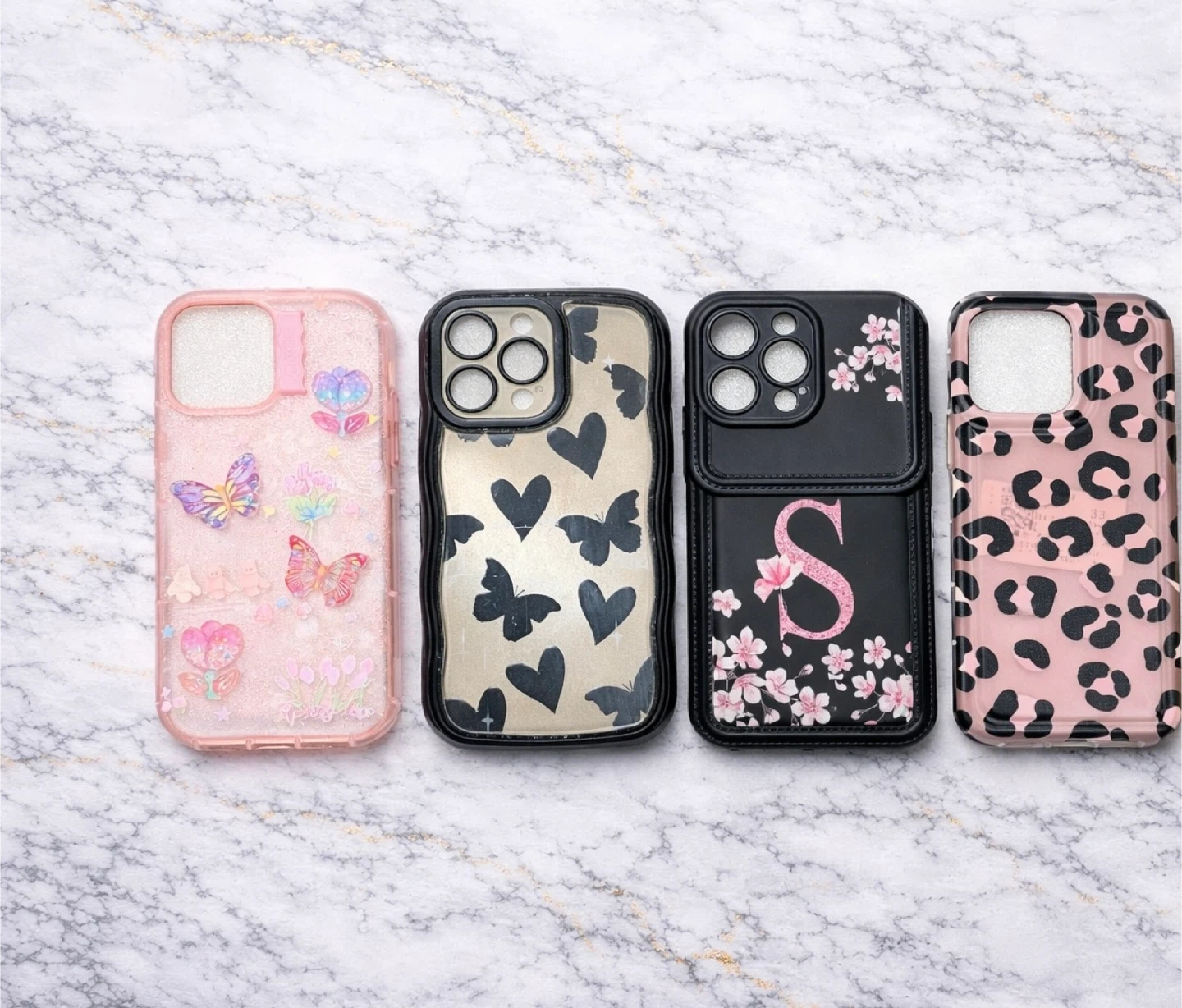 Four stylish iPhone cases to protect your phone! Includes a pink glitter case with butterflies and flowers, a clear case with black hearts and butterflies, a black case with an initial 'S', cherry blossoms and a flip cover, and a pink leopard print case. These cases offer a fun way to personalize and safeguard your device.