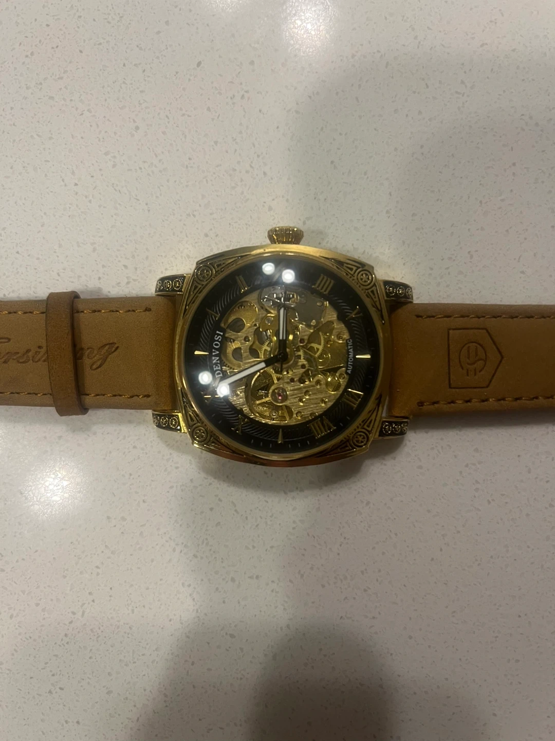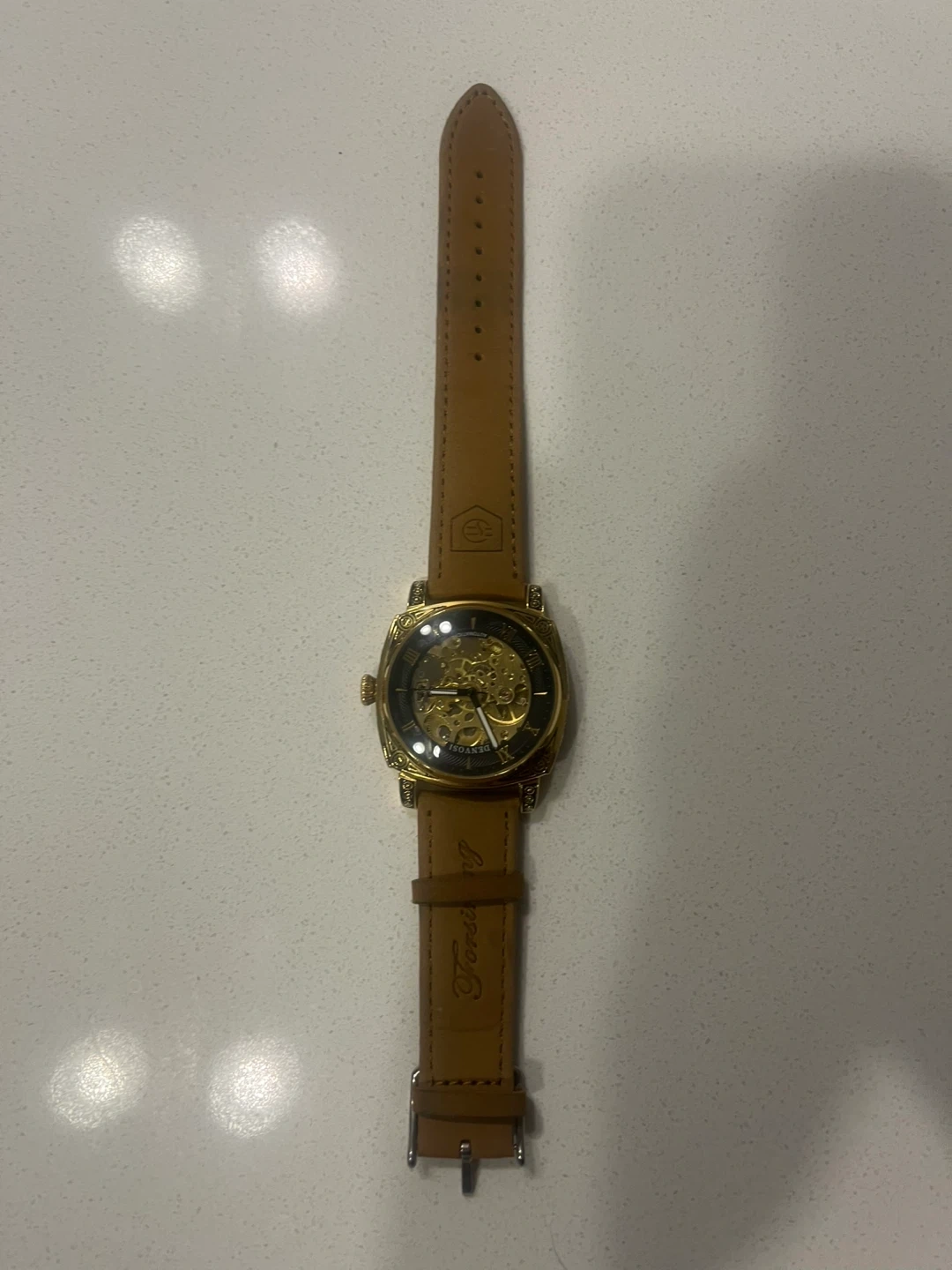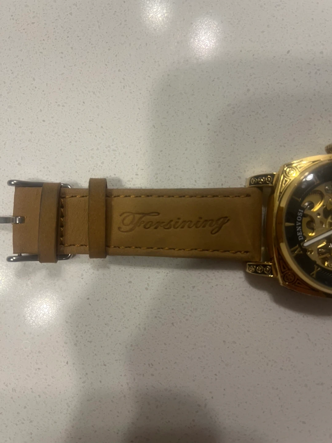 Forsining automatic skeleton watch with a gold-tone case and tan leather strap. It's a mechanical timepiece with a see-through case back. This watch has Roman numeral markers.