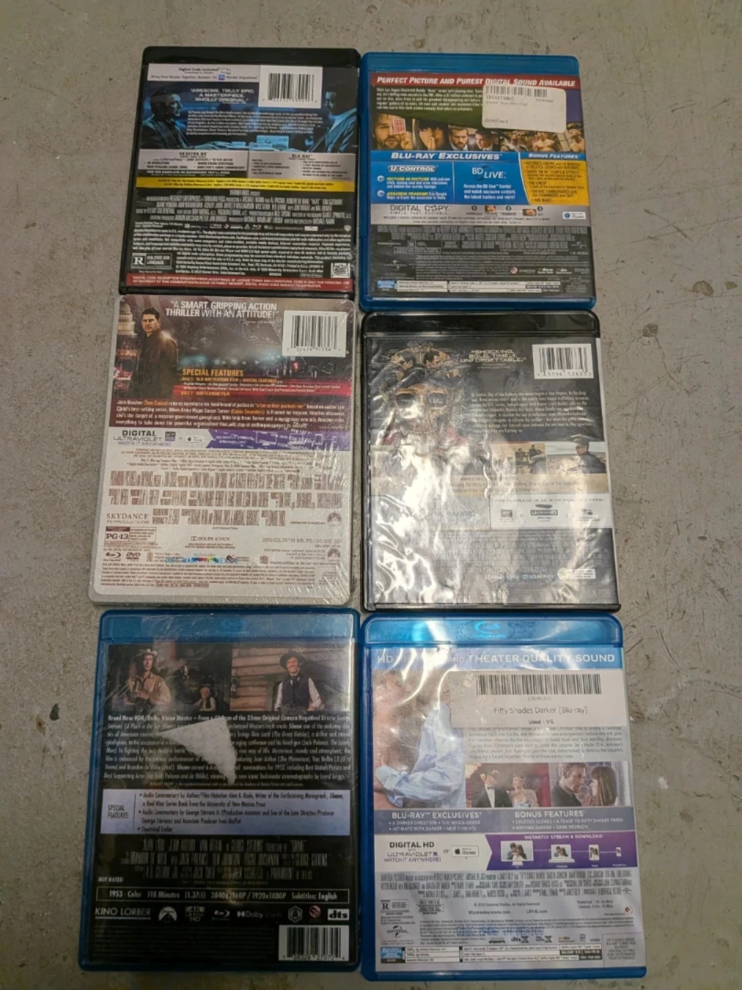 This is a lot of six Blu-ray movies. Includes Heat, Smokin' Aces, Jack Reacher: Never Go Back, Sicario: Day of the Soldado, Shane, and Fifty Shades Darker. All are in standard Blu-ray cases.