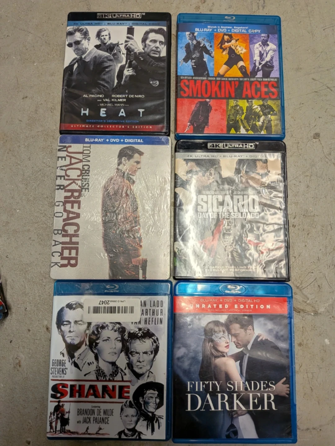 This is a lot of six Blu-ray movies. Includes Heat, Smokin' Aces, Jack Reacher: Never Go Back, Sicario: Day of the Soldado, Shane, and Fifty Shades Darker. All are in standard Blu-ray cases.