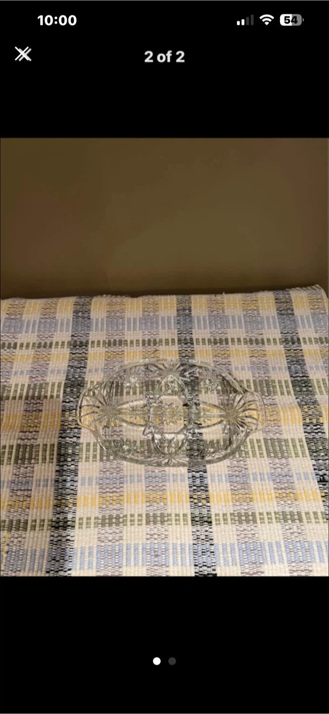 Beautiful oval serving dish made from clear crystal glass. It features a decorative starburst pattern and convenient handles on each side. This elegant piece is perfect for serving desserts or appetizers at your next gathering! Small