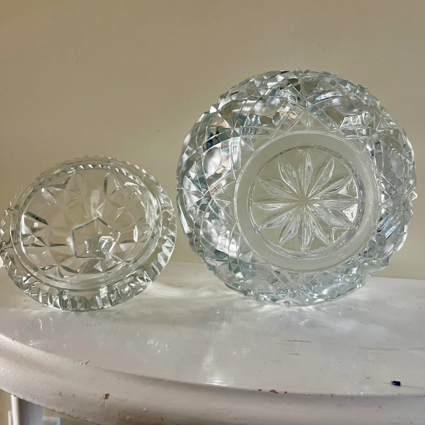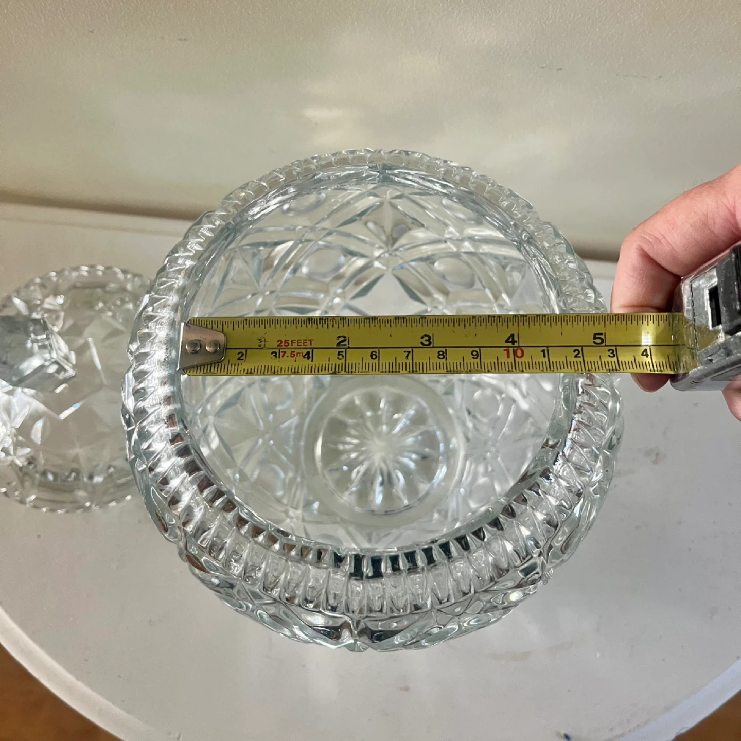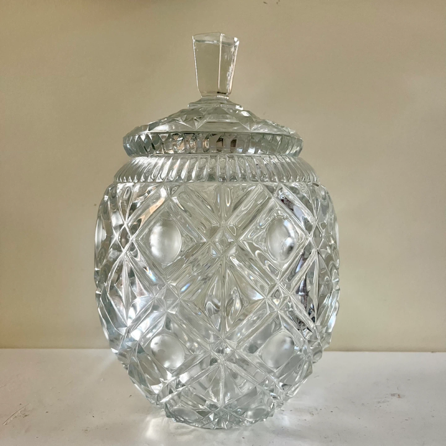 This vintage EAPG (Early American Pattern Glass) biscuit or cookie jar features an extra-large size and a stunning diamond thumbprint pattern. The intricate design is crafted from 24 lead crystal, complete with a matching lid. This is a used item in good vintage condition, with a couple of flea bites on the inner rim of the lid, not visible from the outside.