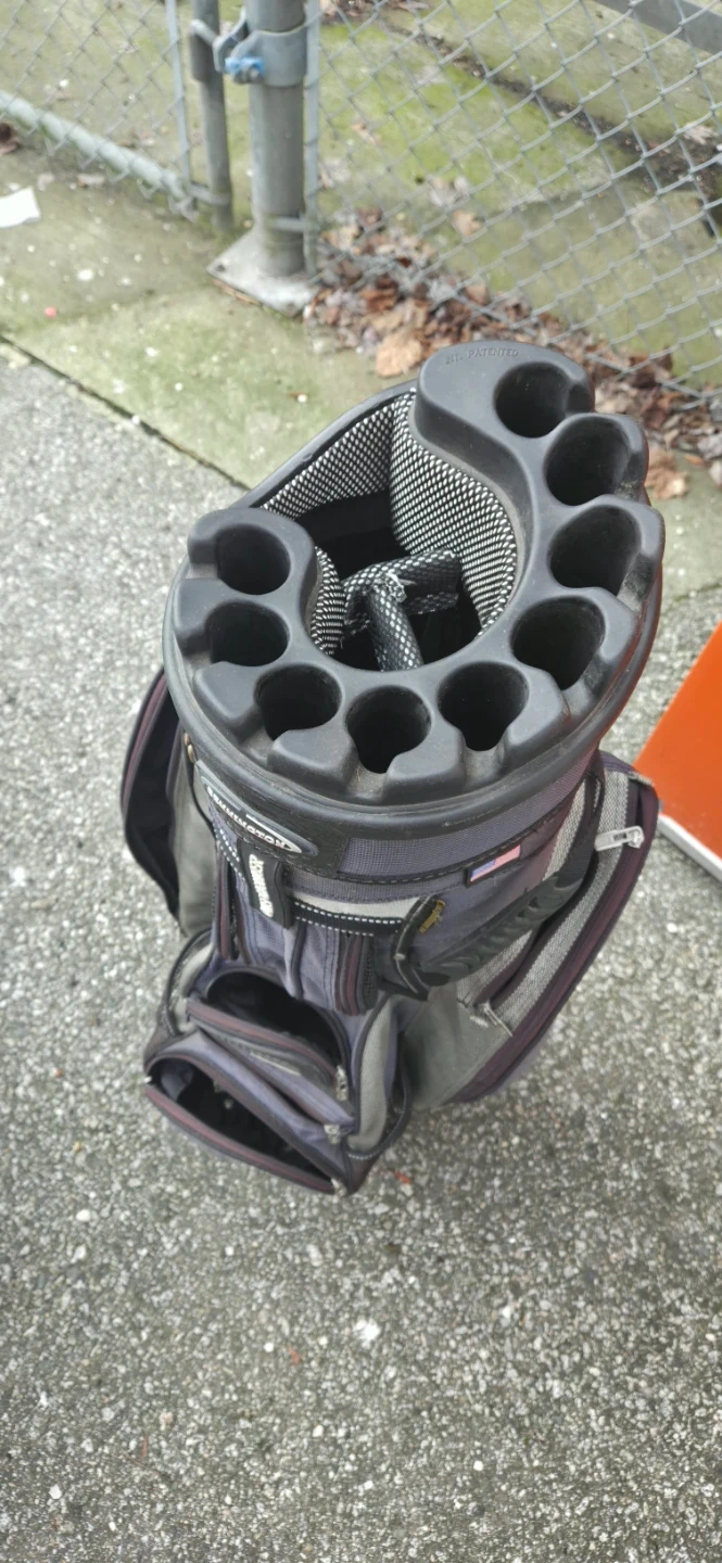 This Bennington golf bag is designed for organization. It features a quiet organizer top with multiple dividers for clubs. Several zippered pockets offer ample storage for your gear. Includes a rain cover.