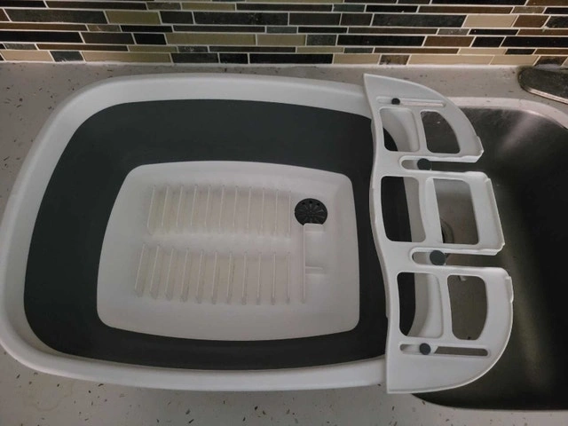 This used dish rack is perfect for any kitchen, designed to efficiently dry your dishes with its foldable design and built-in drainer to prevent water buildup. I'm selling it because I recently upgraded my kitchen setup. It has a foldable design for easy storage and a compact size that fits neatly on countertops. If the ad is up, the dish rack is available and ready to find a new home. Cash accepted.