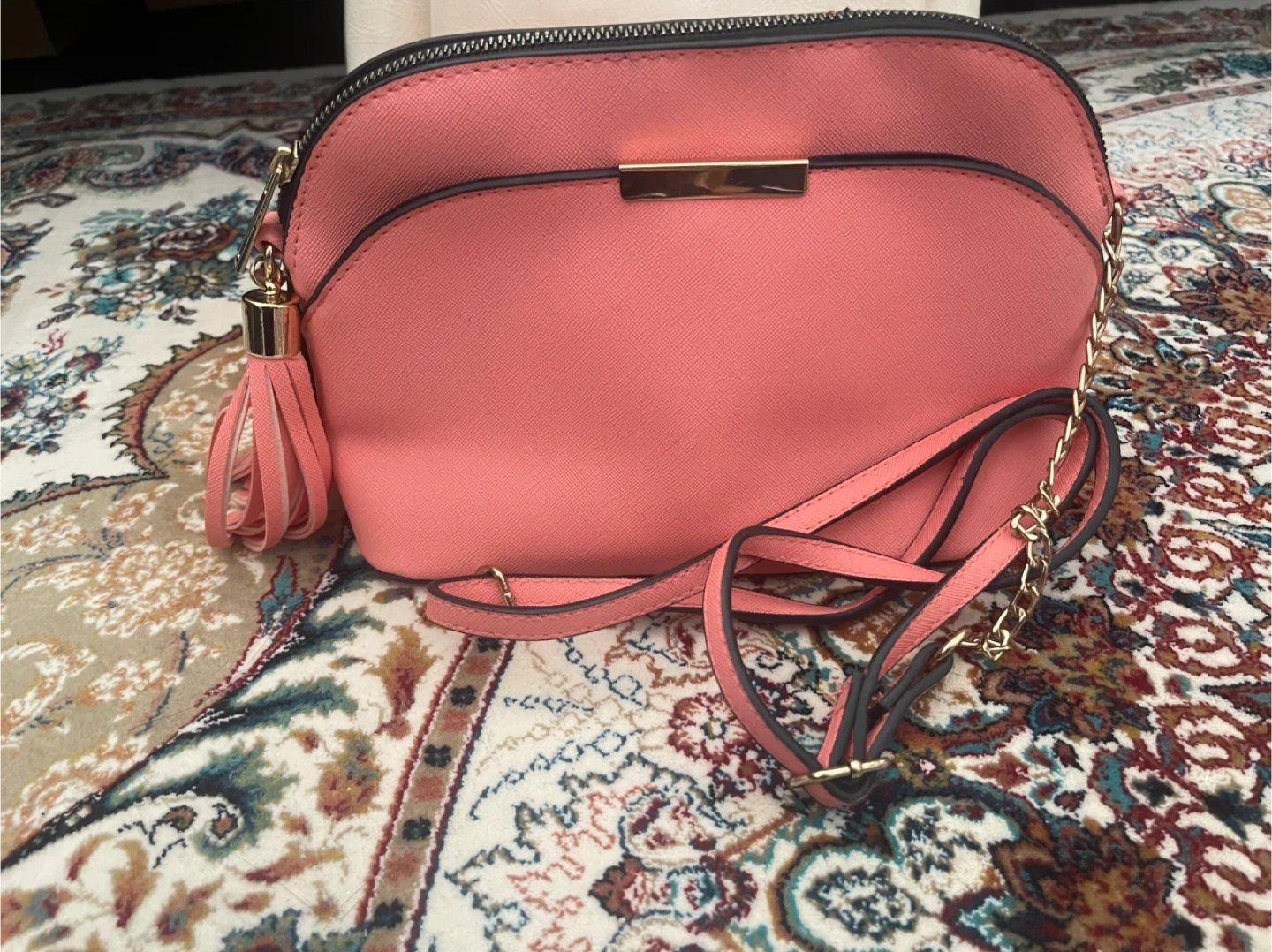 This coral pink crossbody purse has a textured finish and gold-tone hardware. It includes a detachable tassel and a chain-link strap. Its compact size makes it great for carrying essentials.