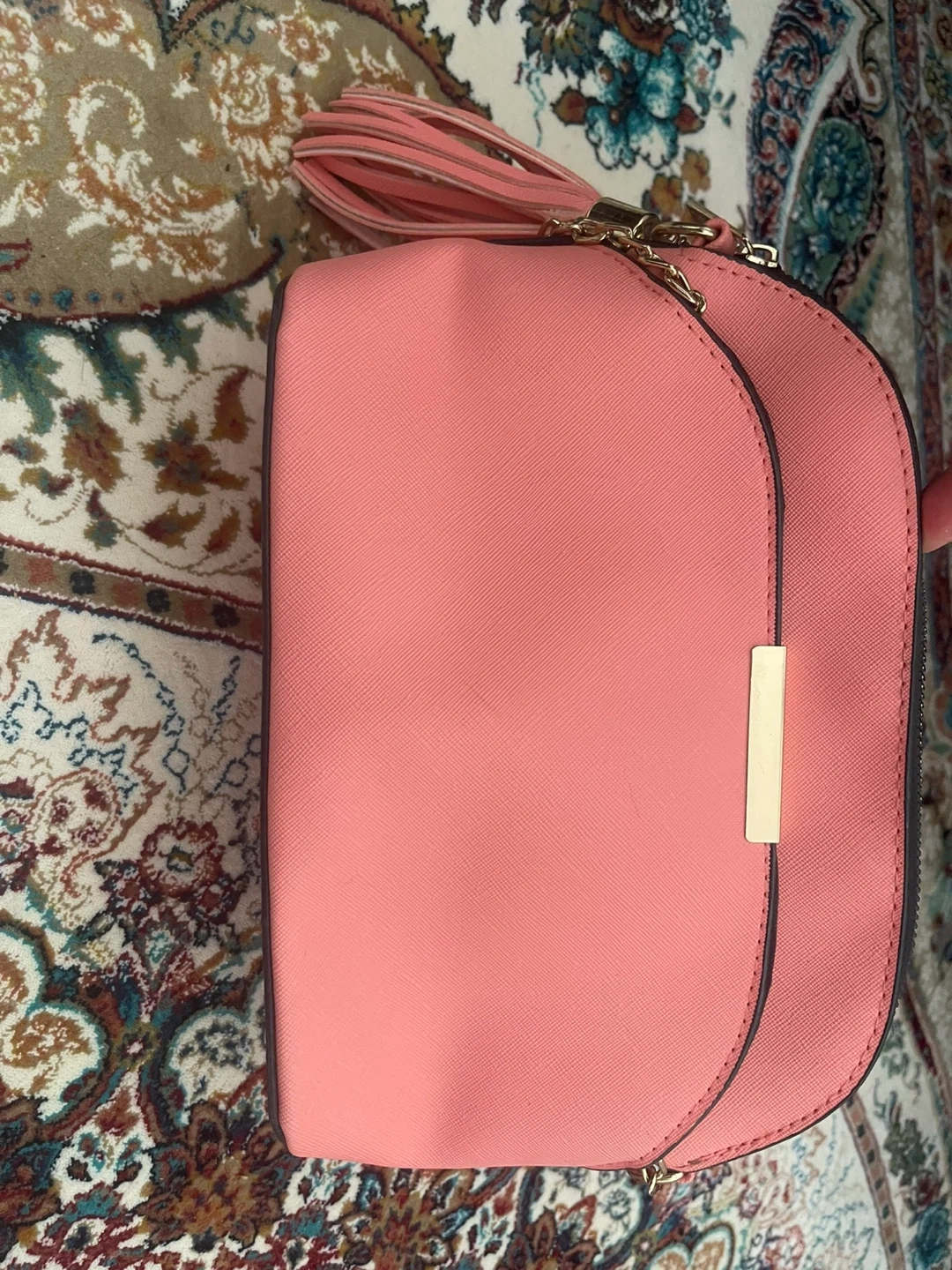 This coral pink crossbody purse has a textured finish and gold-tone hardware. It includes a detachable tassel and a chain-link strap. Its compact size makes it great for carrying essentials.